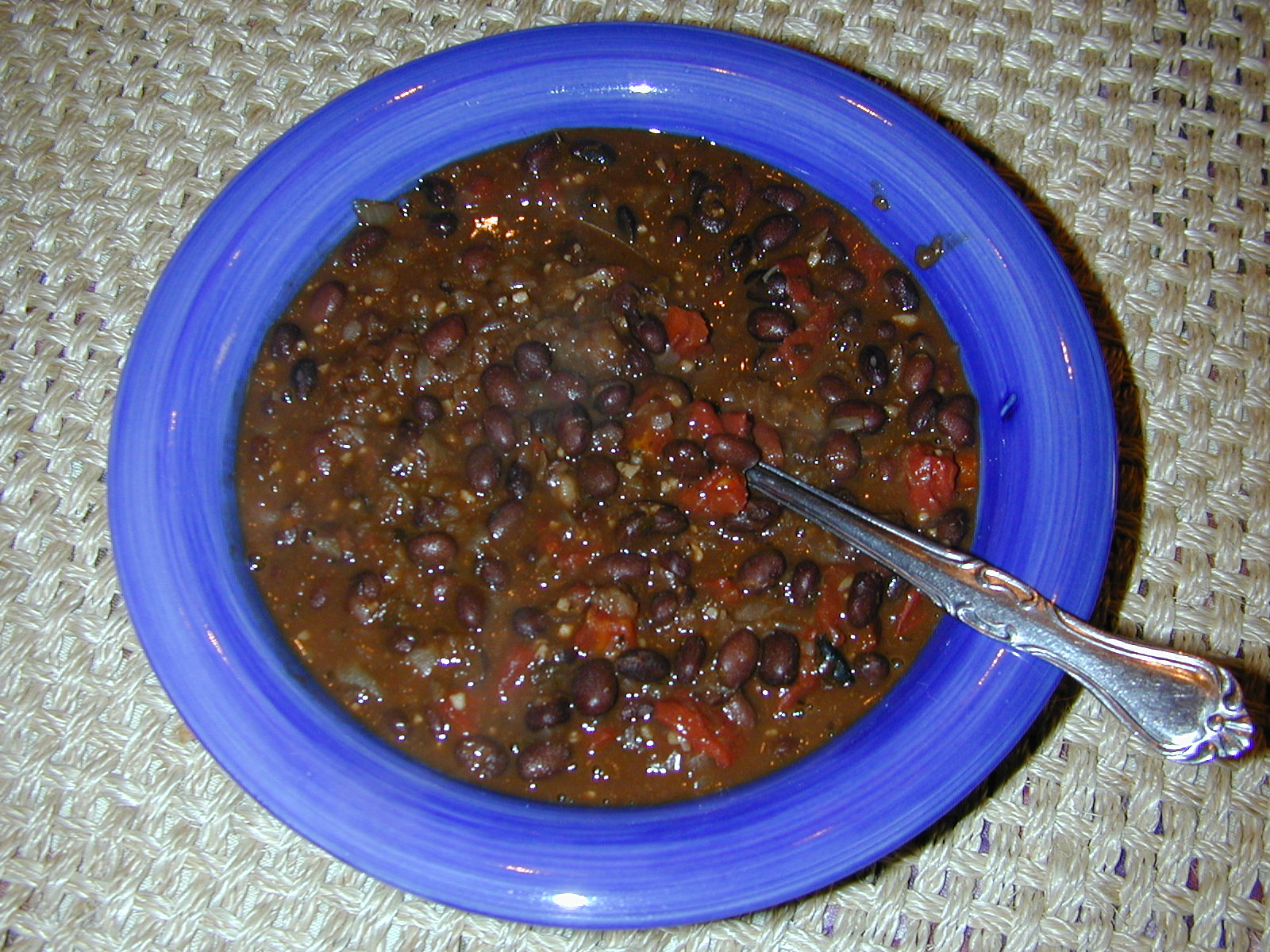 1 can black beans (and liquid) 1 medium onion, finely chopped 3 cloves garlic, minced 1 tomatoes, coarsely chopped 1 tablespoon olive oil 2 tablespoons balsamic vinegar 1?2 teaspoon mild chili powder 1?2 teaspoon ground cumin 1 tablespoon dried oregano, crushed 1?2 teaspoon cinnamon black pepper your favorite hot sauce 1 cup uncooked white rice 2 cups water 1 tablespoon oil (optional) or 1 tablespoon butter (optional)