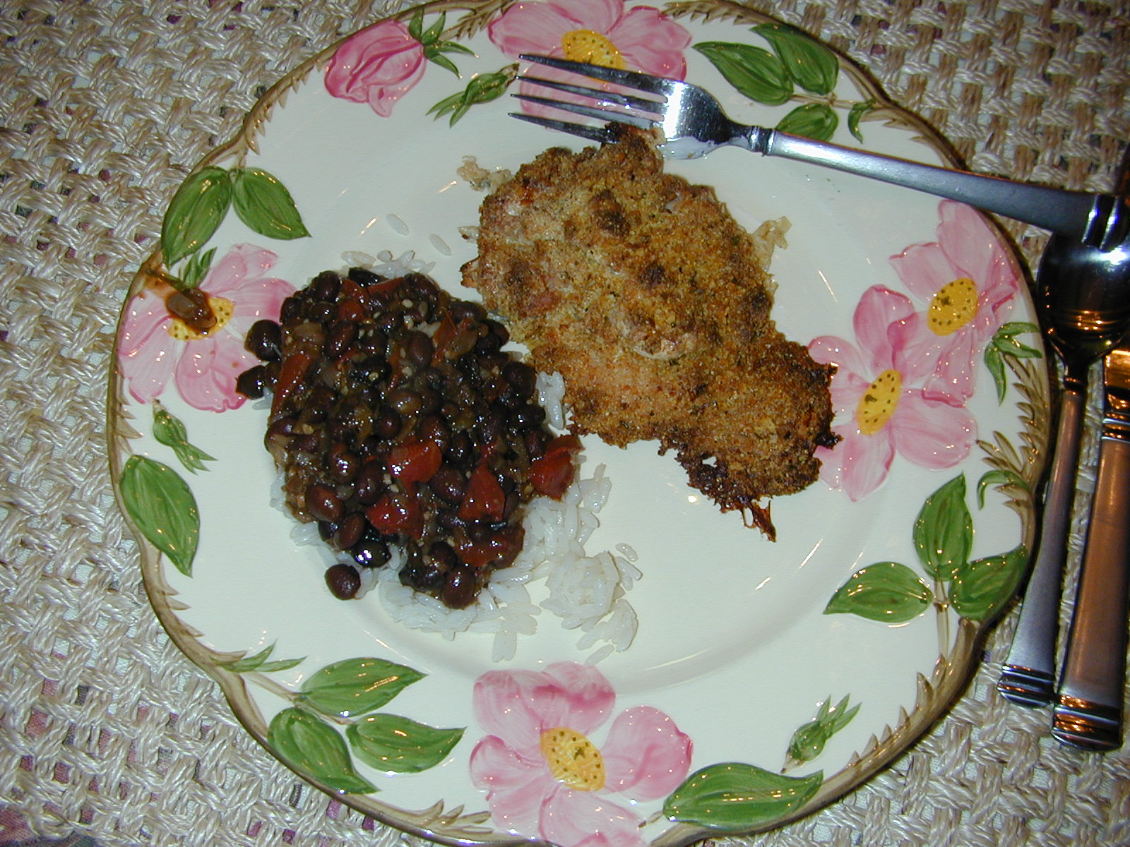 Start the water boiling in a fairly large pot; add the fat (if desired). When it boils, add the rice. Stir for the first minute, then cover and turn the heat as low as possible. Rice should only cook for 20 minutes; you'll get perfect white rice every time by following a 2:1 rice-water ratio and following these directions. Heat a saucepan slightly, then add oil and heat that briefly as well (this prevents sticking). Saute the onion until aromatic, then add garlic; don't brown. Turn the heat down to medium low. Dump the whole can of beans in. Add the vinegar, spices and chopped tomato, stir, and let simmer, covered. When rice is done (20 minutes), remove from heat. Serve beans over rice.