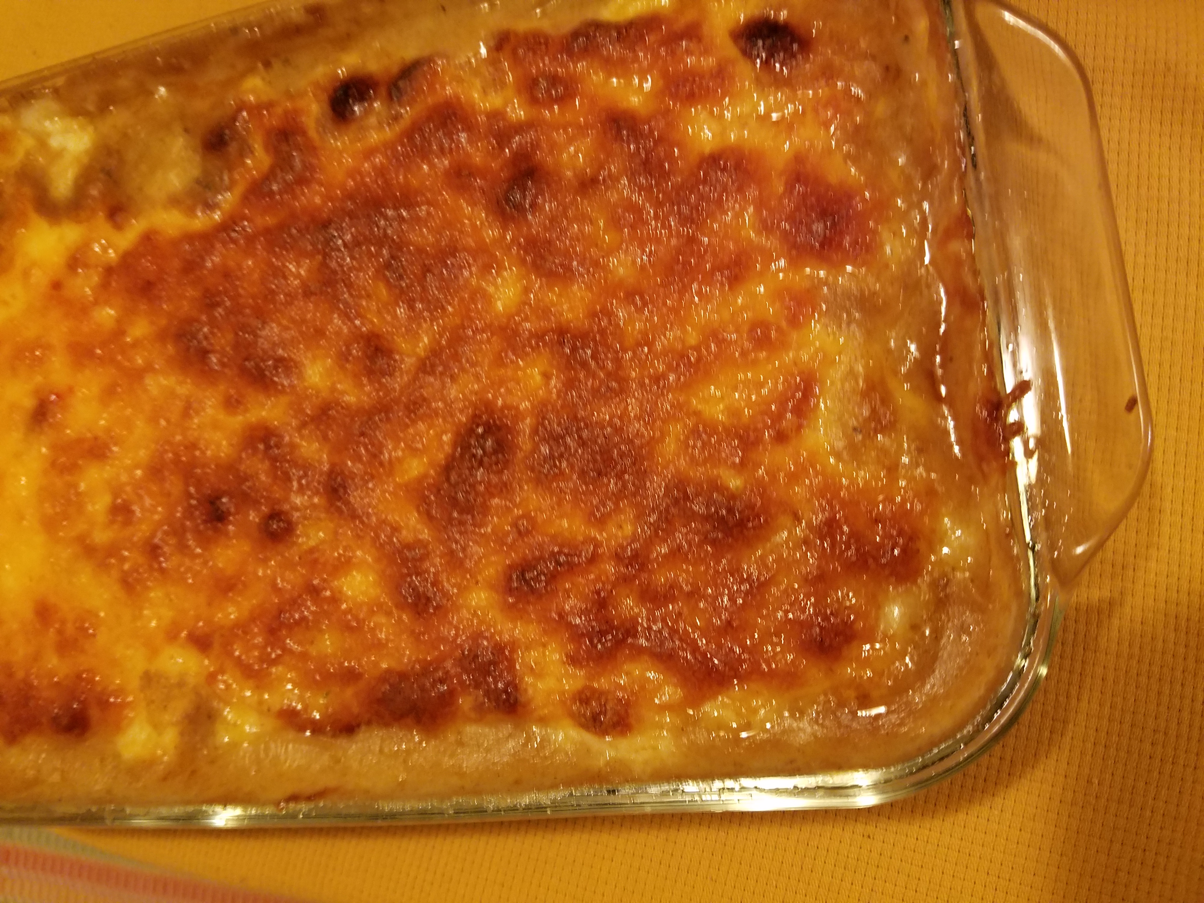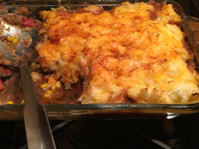 Cook the corn according to the package instructions. Drain and set aside. Melt the butter in a large skillet over medium heat. Saut the onion and celery in the butter, stirring often, for about 5 to 6 minutes. Add ground beef and brown. Drain any excess fat! set the heat to medium low, Stir the garlic and flour into the beef mixture. Stir in the beef broth, then the canned tomatoes, the herbs, corn, and Worcestershire sauce. Gently simmer the mixture for several minutes, partially covered, then add salt and pepper to taste. Transfer the mixture to a large casserole. Set the oven to 400 Cook mashed potatoes according to package instructions. When done add 1/2 cup sour cream. Spoon on to top of meat mix. Sprinkle with cheese and paprika. Bake on the center oven rack for about 20 minutes, until the top is golden brown. Cool for several minutes before serving.