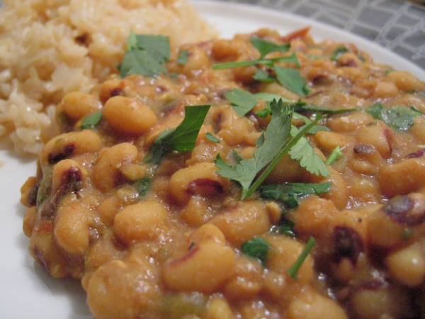 1?3 cup vegetable oil or 1/3 cup ghee 1 -2 green chili, minced 8 garlic cloves, minced 1 medium onion, diced 1 inch gingerroot, peeled and minced 4 1?2 teaspoons curry powder or 4 1/2 teaspoons garam masala 2 1?2 teaspoons turmeric 1?2 teaspoon ground cumin 1 cup freshly chopped tomatoes salt, to taste 2 1?2 cups dried black-eyed peas, soaked in water for 3-4 hours 1?2 cup plain yogurt 2?3 cup chopped cilantro