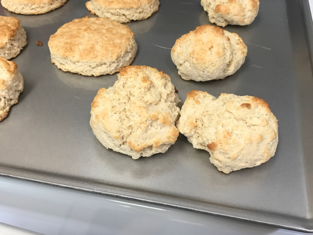 Preheat oven to 425 F Mix first 4 ingredients together in a bowl. Cut in butter with a pastry blender or a fork, or two knives, until crumbly. Add milk. Stir until it forms a ball. Add a bit more milk if necessary to make a soft dough. Roll or pat to 1 inch thick. (I usually pat the dough). Cut into circles with a biscuit cutter or a floured glass. Arrange on a greased baking sheet. Bake in 425 F for about 10- 12 minutes or until risen and nicely browned. (in my oven it usually takes 15 minutes). This is supposed to make 12, but I almost always only get 11 biscuits, with the size of the glass that I use. Variations: Try adding some fresh or dried herbs. Some good pairings are basil and oregano, or parsley and fresh ground black pepper, or thyme and garlic, or add some grated sharp or old cheddar cheese.
