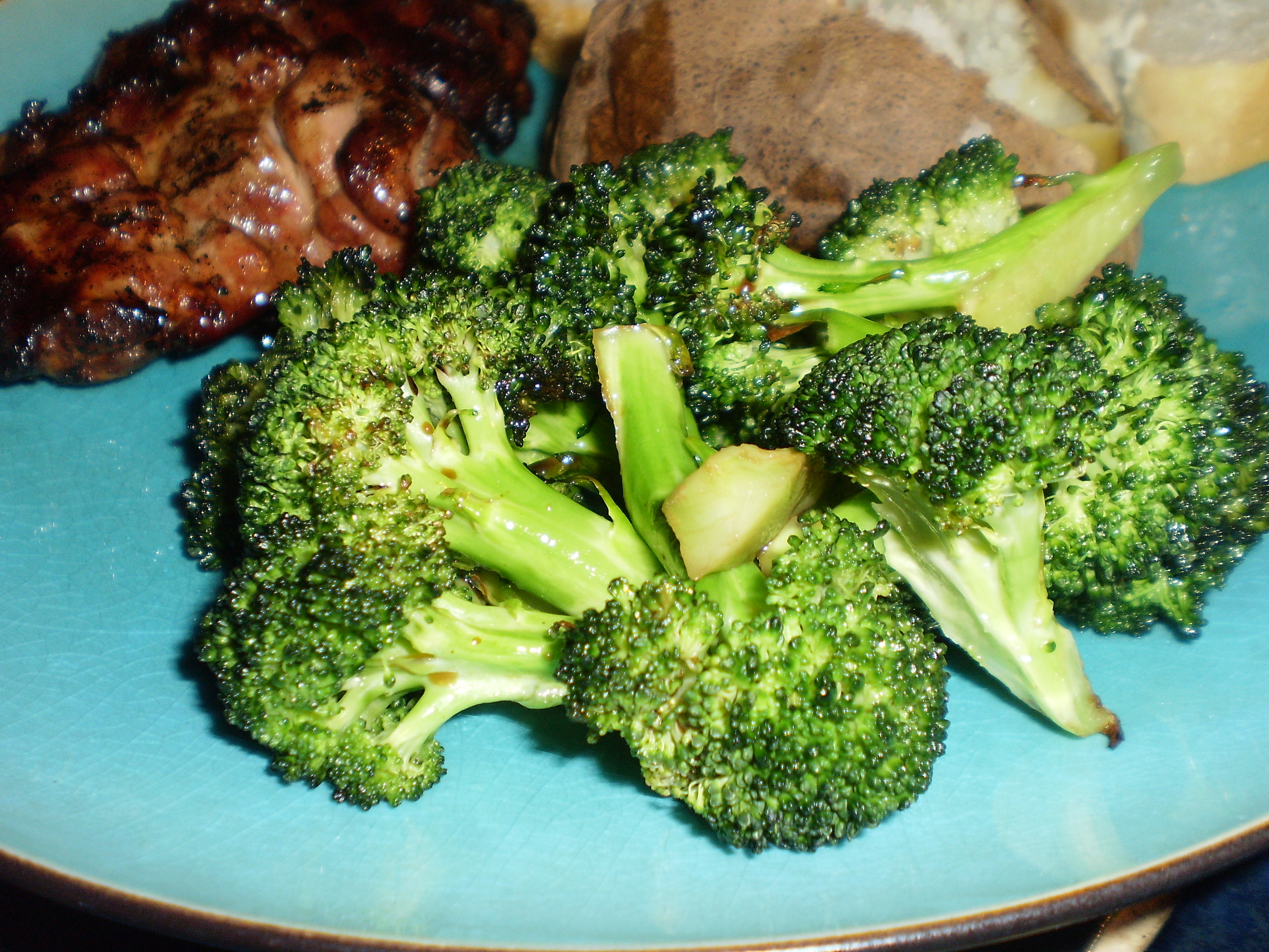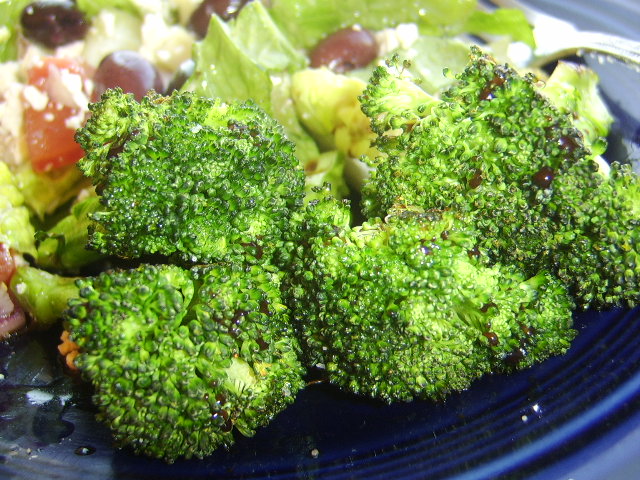 4 cups broccoli florets, rinsed and slightly drained olive oil, to taste sea salt, to taste balsamic vinegar, to taste