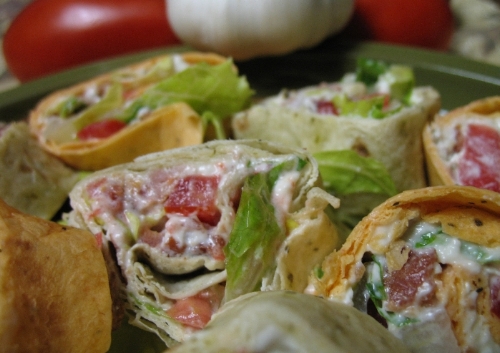 In a small bowl mix cream cheese, mayo, and sun dried tomatoes. Add bacon but be careful not to crumble it too much. Spread mayo mixture over tortillas and top each with plum tomatoes and lettuce. Roll tightly and secure in plastic wrap. Refrigerated for one hour so they get firm. To serve cut each roll into 1 inch thick sliced with a serrated knife. A regular knife will squish them!