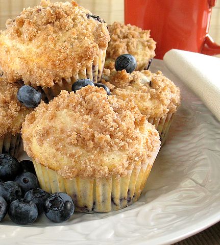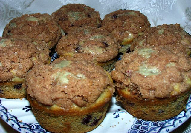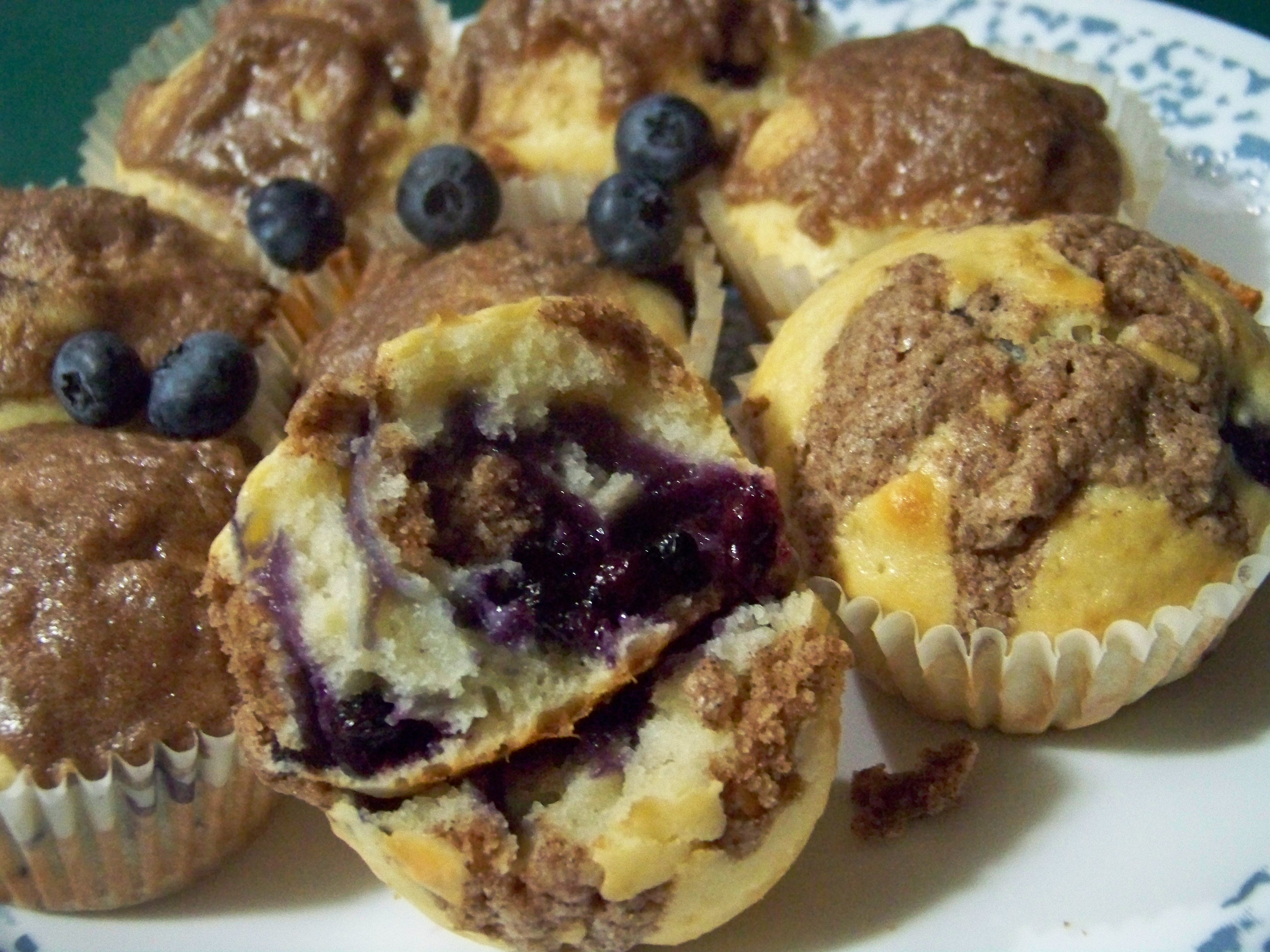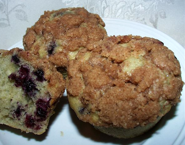 STRUESEL TOPPING 1?3 cup flour 1?3 cup white sugar 1 teaspoon cinnamon 3 tablespoons butter (soften) MUFFIN 1 1?2 cups flour 1?2 cup sugar 2 teaspoons baking powder 1?2 teaspoon salt 1 cup milk 1?4 cup butter (melted) 1 egg 1 teaspoon vanilla 1 - 1 1?4 cup blueberries, I use a cupful (fresh or if using frozen do not thaw)