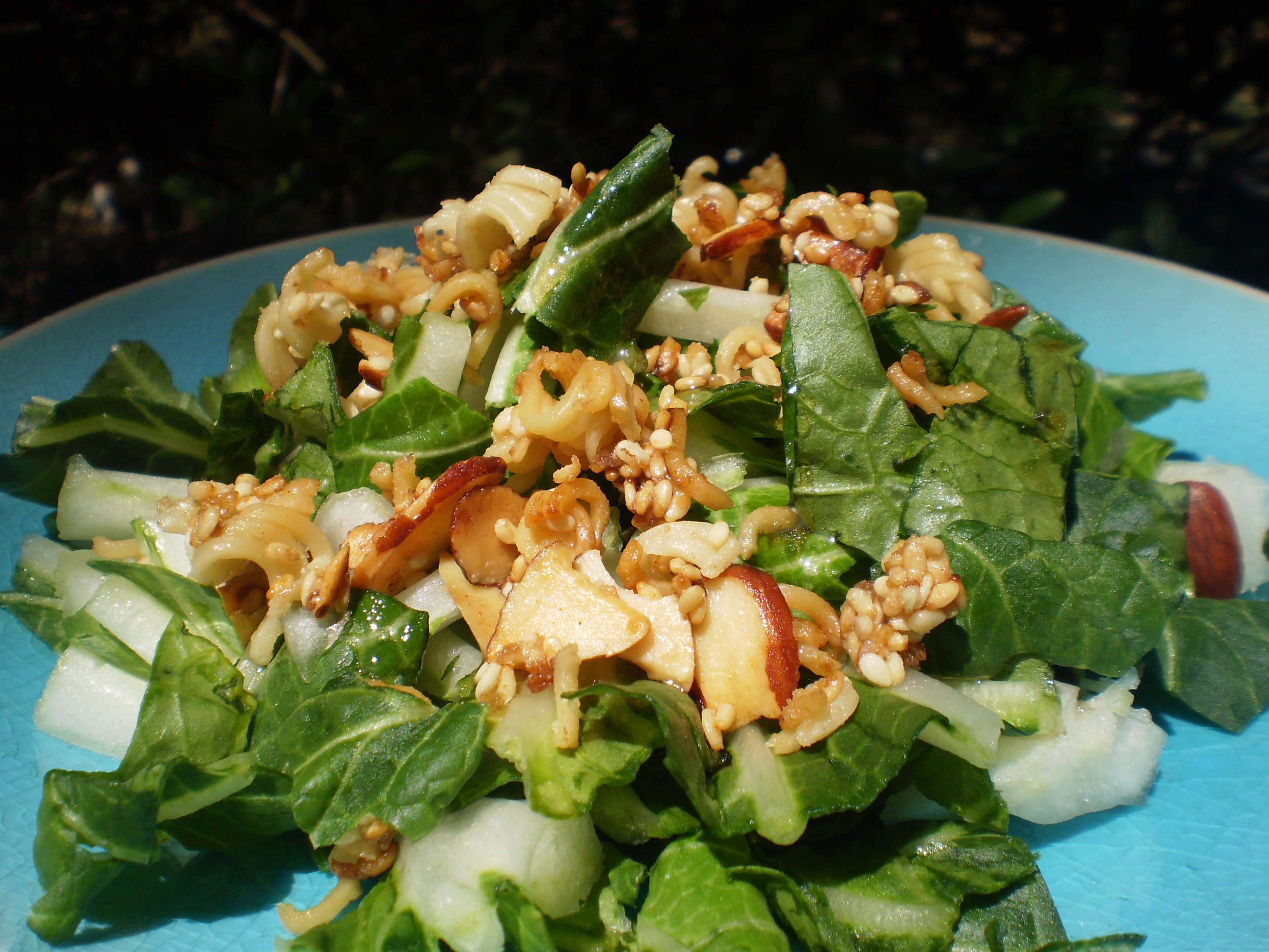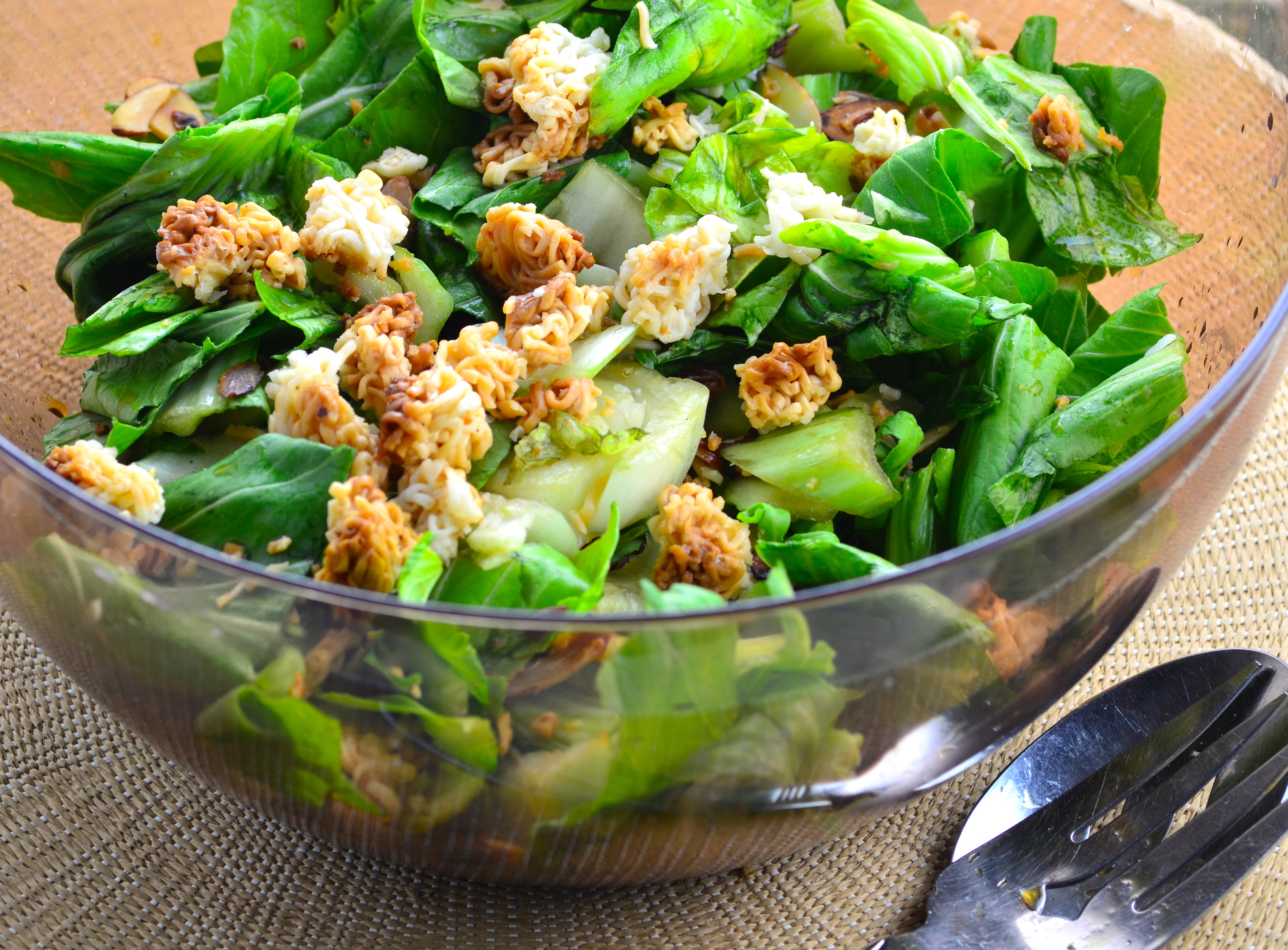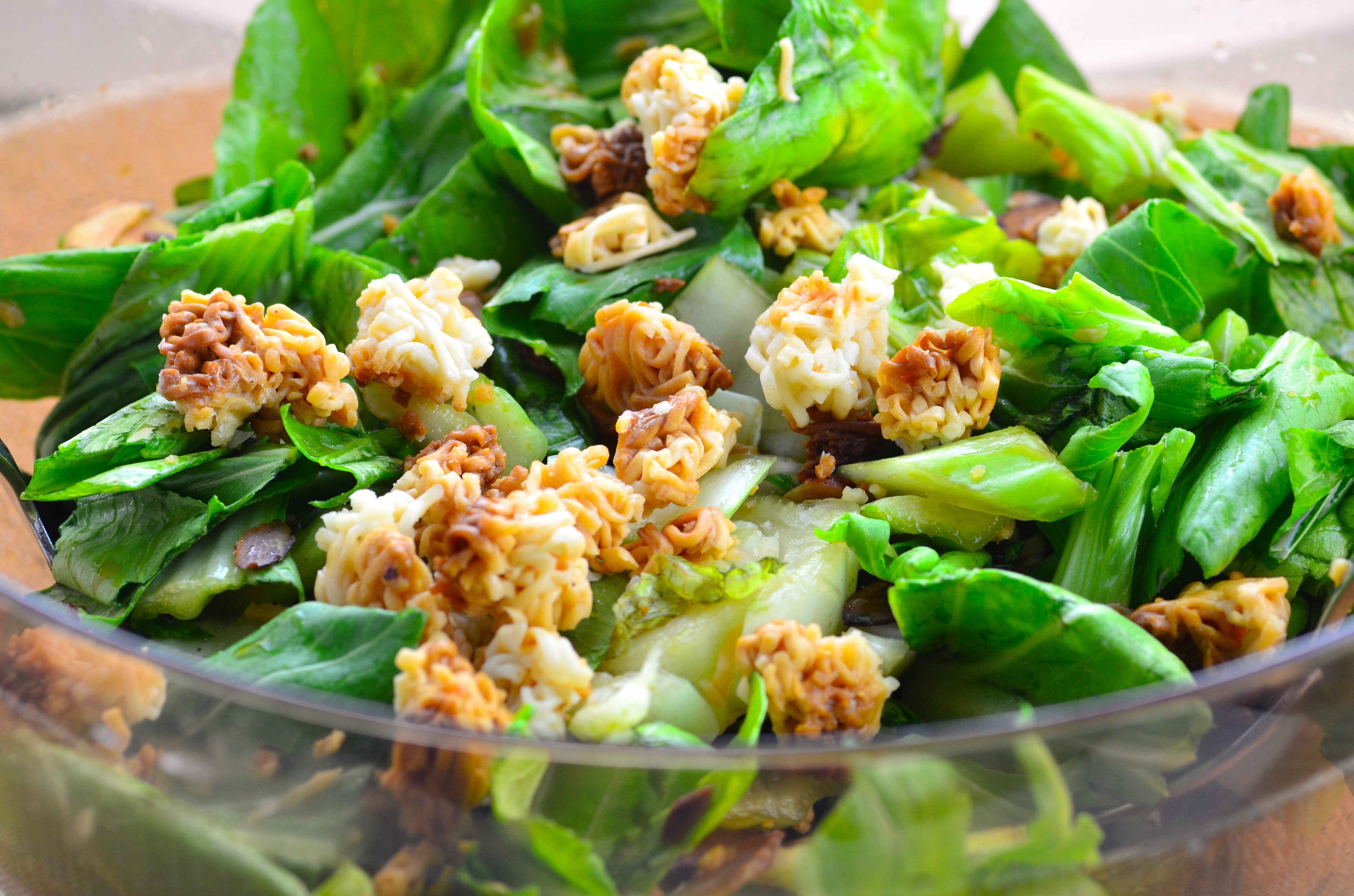 In large pan melt butter and add sesame seeds, sugar, broken ramen noodles, almonds. Brown and set aside to cool. After cooled, break up and set aside in small bowl. Wash and chop bok choy (smaller is better) and green onions in large salad bowl. Dressing Mix vegetable oil, red wine vinegar, sugar, and soy sauce. Just prior to serving the salad, (plan for this salad to be the last thing you pull together for the event), mix bok choy and ramen noodles mixture. Drizzle dressing over salad or pass dressing around in small bowl.