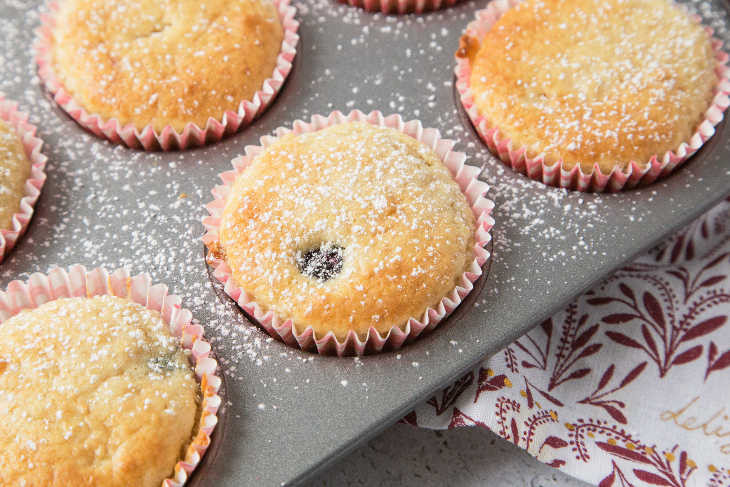 Preheat oven to 400 degrees. Toss blueberries with about 2 tablespoons flour and set aside. Combine remaining flour with the other dry ingredients and set aside. In a large mixer bowl, cream the cream cheese, lemon juice and vanilla until smooth. Add eggs, then flour mixture, butter and milk and mix until just moistened. Fold in the blueberries. Fill paper-lined muffin pans 2/3 full. Bake for 18-20 minutes or until lightly browned. Remove from pan immediately.