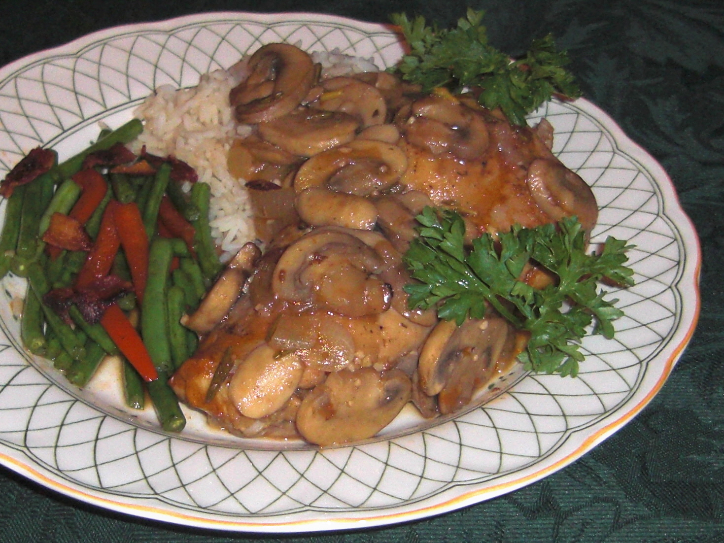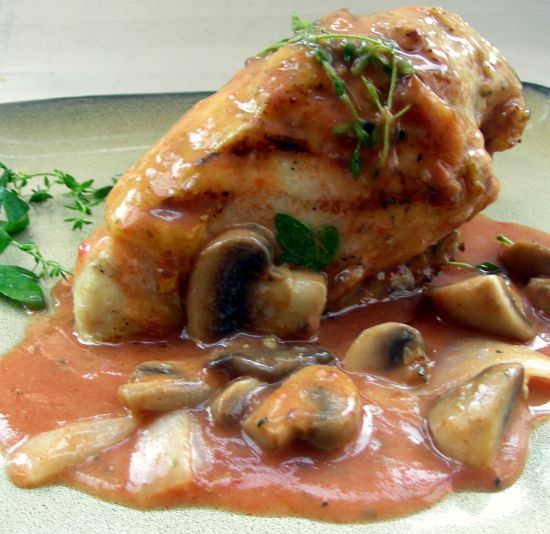 Set a 10-inch, straight-sided saute pan over medium-high heat and add the oil. Season the chicken thighs with the Essence, salt and pepper. Place the chicken, skin side down in the pan and sear until golden brown, about 3 to 4 minutes. Turn the chicken over and sear on the second side for another 3 to 4 minutes. Remove the chicken from the pan and add the butter and mushrooms. Saute the mushrooms, stirring occasionally, until browned and most of the liquid has evaporated, about 4 to 5 minutes. Add the onions and garlic to the pan and saute for 3 to 4 minutes. Sprinkle the flour into the pan and cook, stirring often to make a light brown roux, about 4 to 5 minutes. Add the tomato paste, stock and rosemary to the pan, bring to a boil and reduce to a simmer. Return the chicken to the pan, skin side down and cook the chicken for 30 minutes. Turn the chicken over and cook until the meat is very tender, about 30 minutes. Serve the chicken over rice and garnish with the chopped parsley. Emeril's ESSENCE Creole Seasoning (also referred to as Bayou Blast): Combine all ingredients thoroughly. Yield: 2/3 cup.