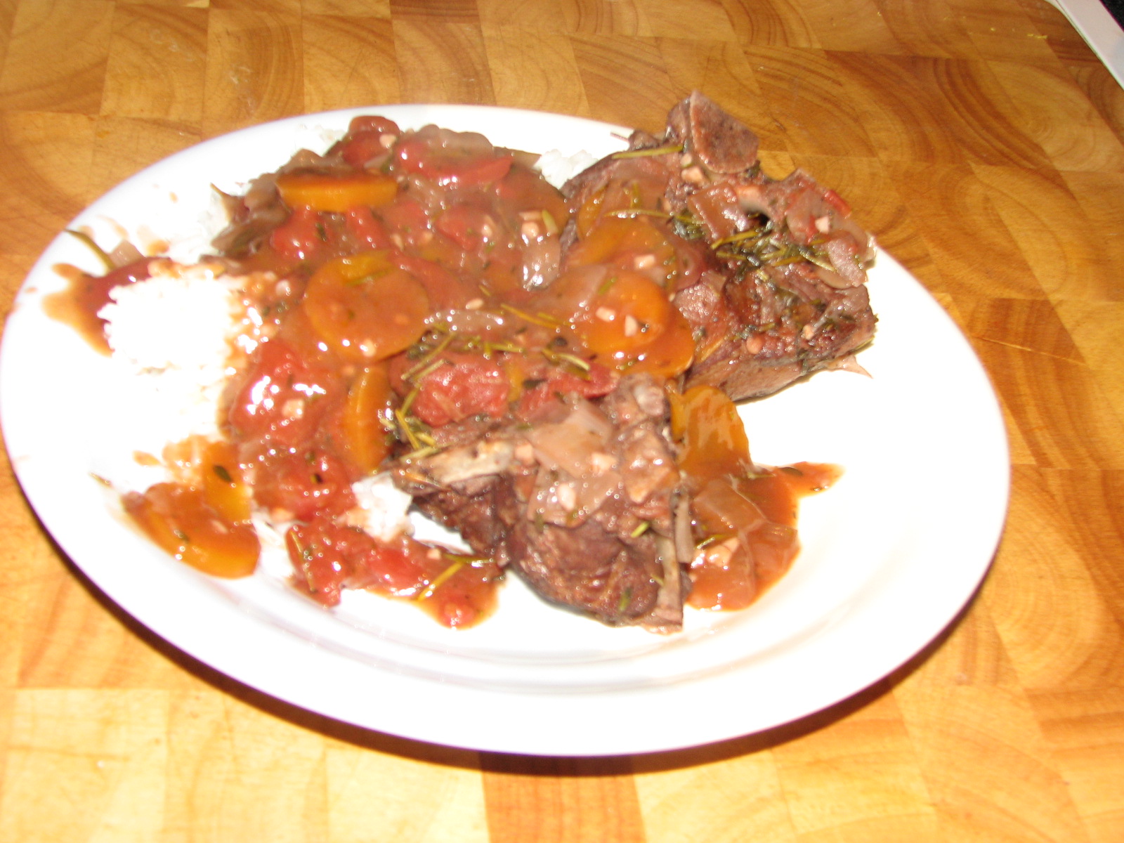 6 lamb shanks (I have also used leg of lamb, ask the butcher to cut it in 1 1/2 in. slices or use a cut-up boneless) 2 tablespoons olive oil 2 medium onions, chopped 3 large carrots, peeled and cut into 1/2 inch thick rounds 10 garlic cloves, minced 1 (750 ml) bottle dry red wine (Sangiovese is good) 1 (28 ounce) can diced tomatoes with juice 1 (14 1/2 ounce) can low sodium chicken broth 1 (14 1/2 ounce) can beef broth 5 teaspoons chopped fresh rosemary 2 teaspoons chopped fresh thyme 2 teaspoons grated lemon zest
