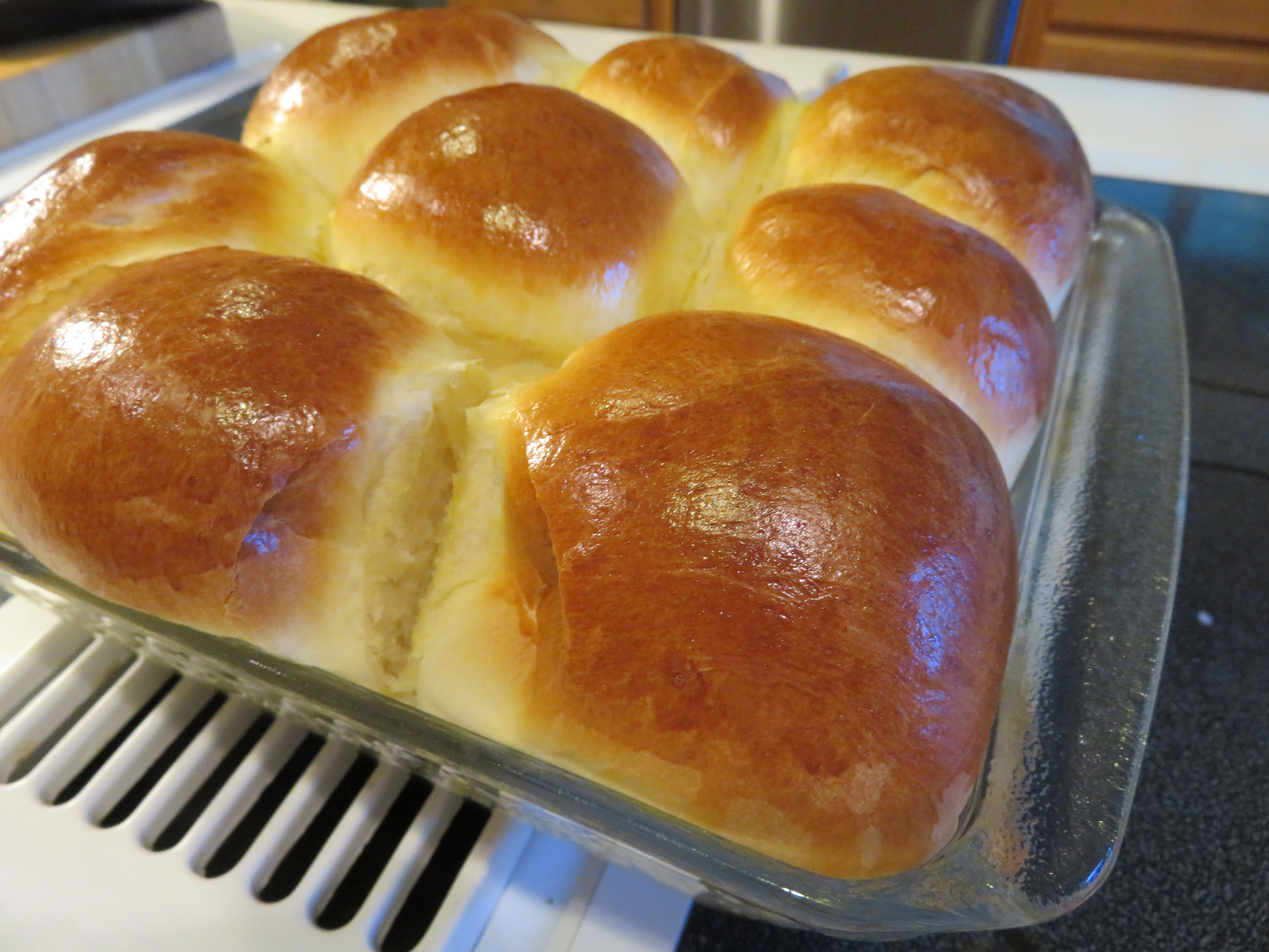 Place ingredients into bread machine according to manufacturers directions. Select dough cycle. When cycle is complete, shape dough as desired or wrap in plastic wrap and refrigerate up to 24 hours. If refrigerated, let dough set out for an hour before using. To shape, divide dough into 24 equal parts and roll into balls in your hand. Place on lightly greased baking sheet. Cover rolls with damp cloth and let rise for about 20 minutes or until doubled in size. Bake in preheated 400 oven for 15 to 20 minutes. Brush tops with melted butter.