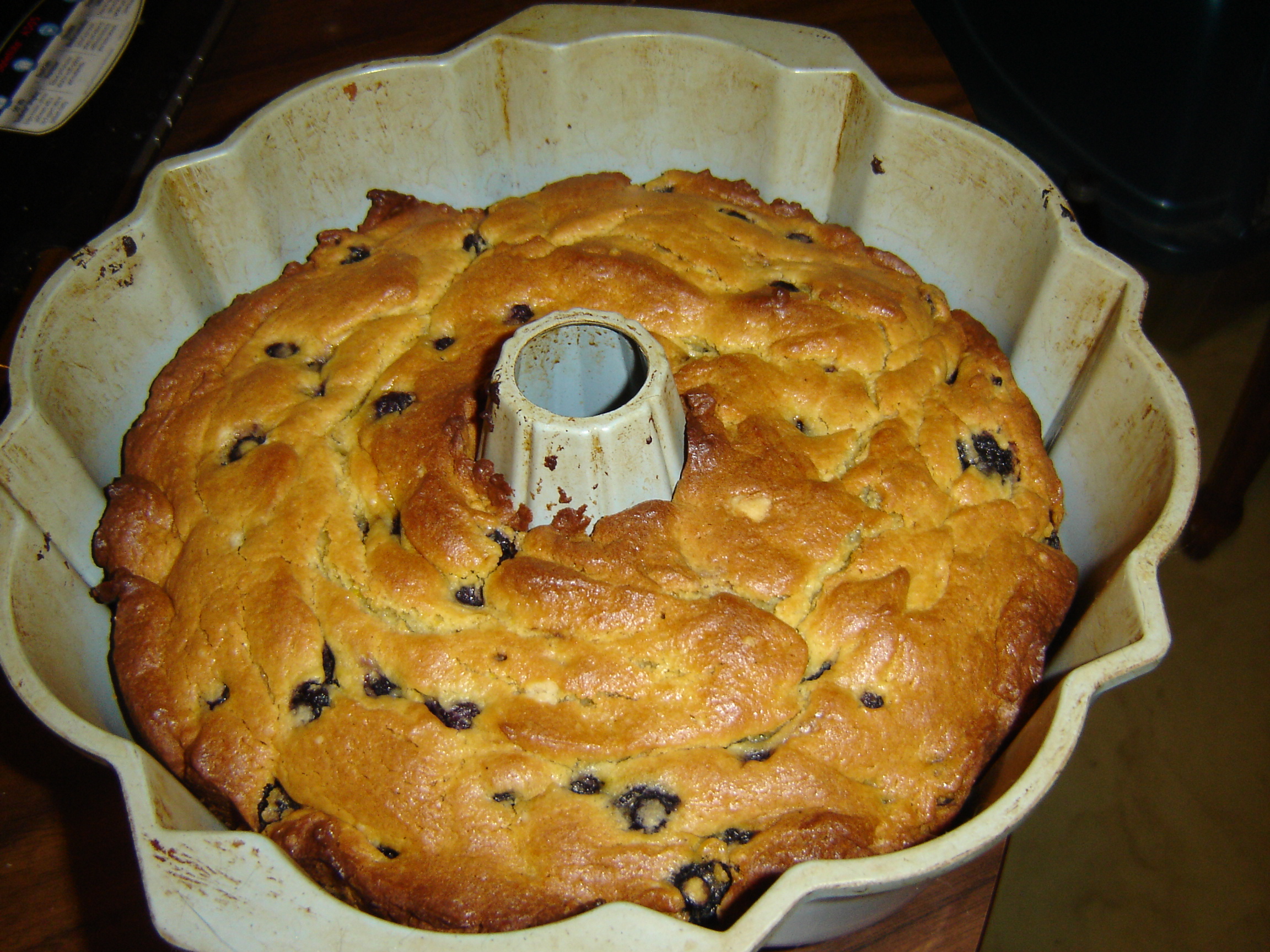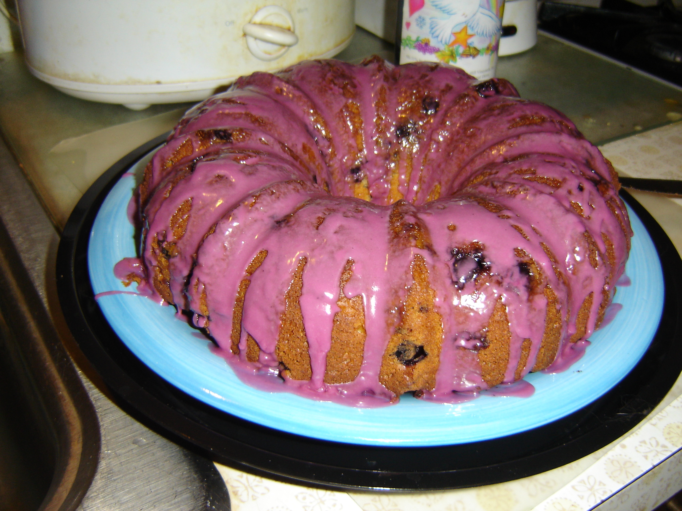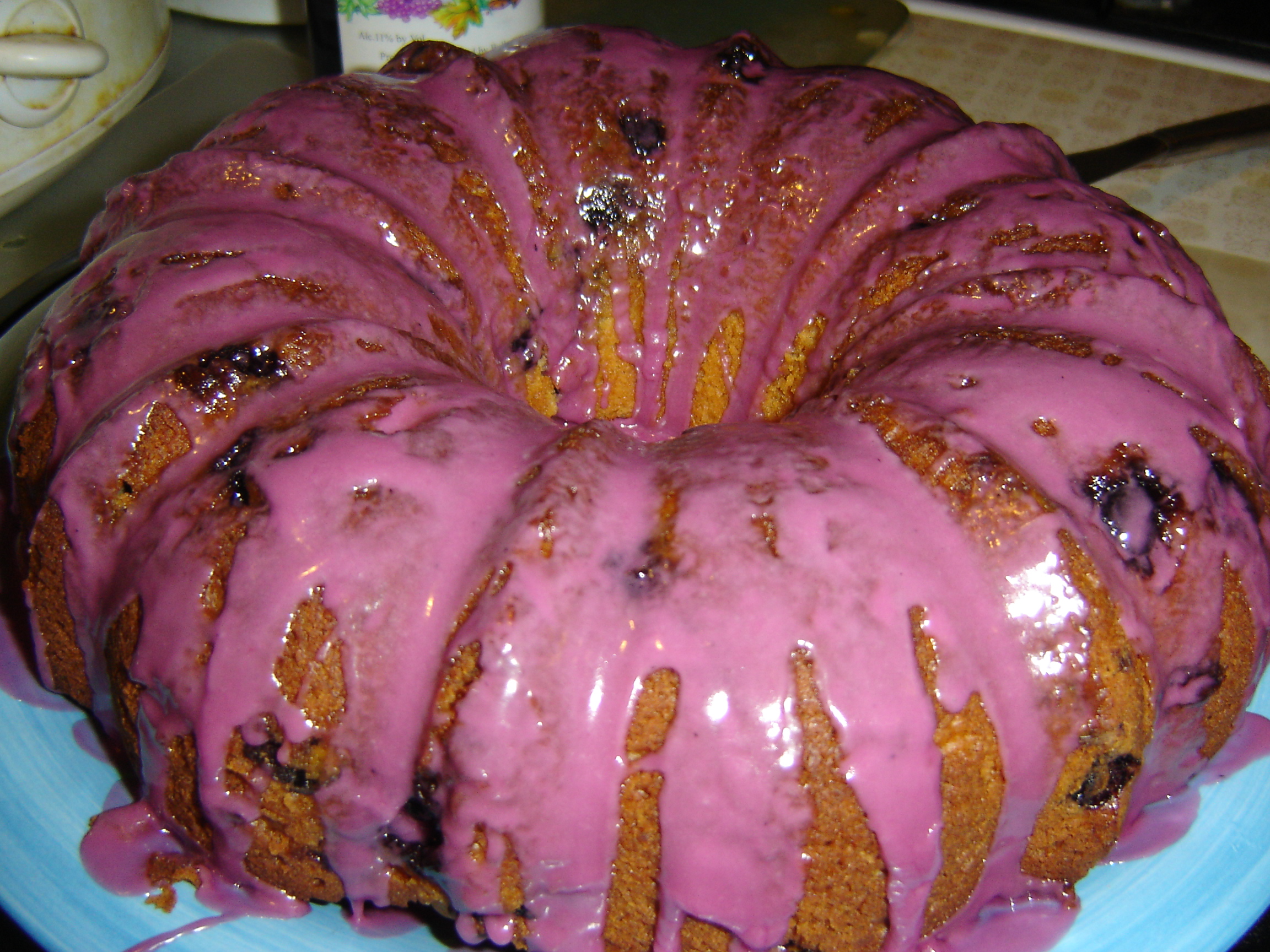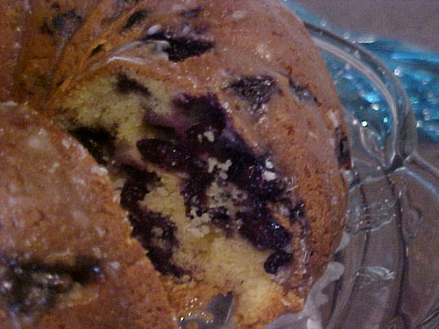Mix cake mix, oil, eggs, cream cheese and vanilla pudding on medium speed (mixture will be very thick). Fold in blueberries; pour in Bundt cake pan. Bake at 350 degrees for 30 minutes or until done. Icing: Mix blueberry juice and 2 cups confectioners sugar and pour over cake while hot.