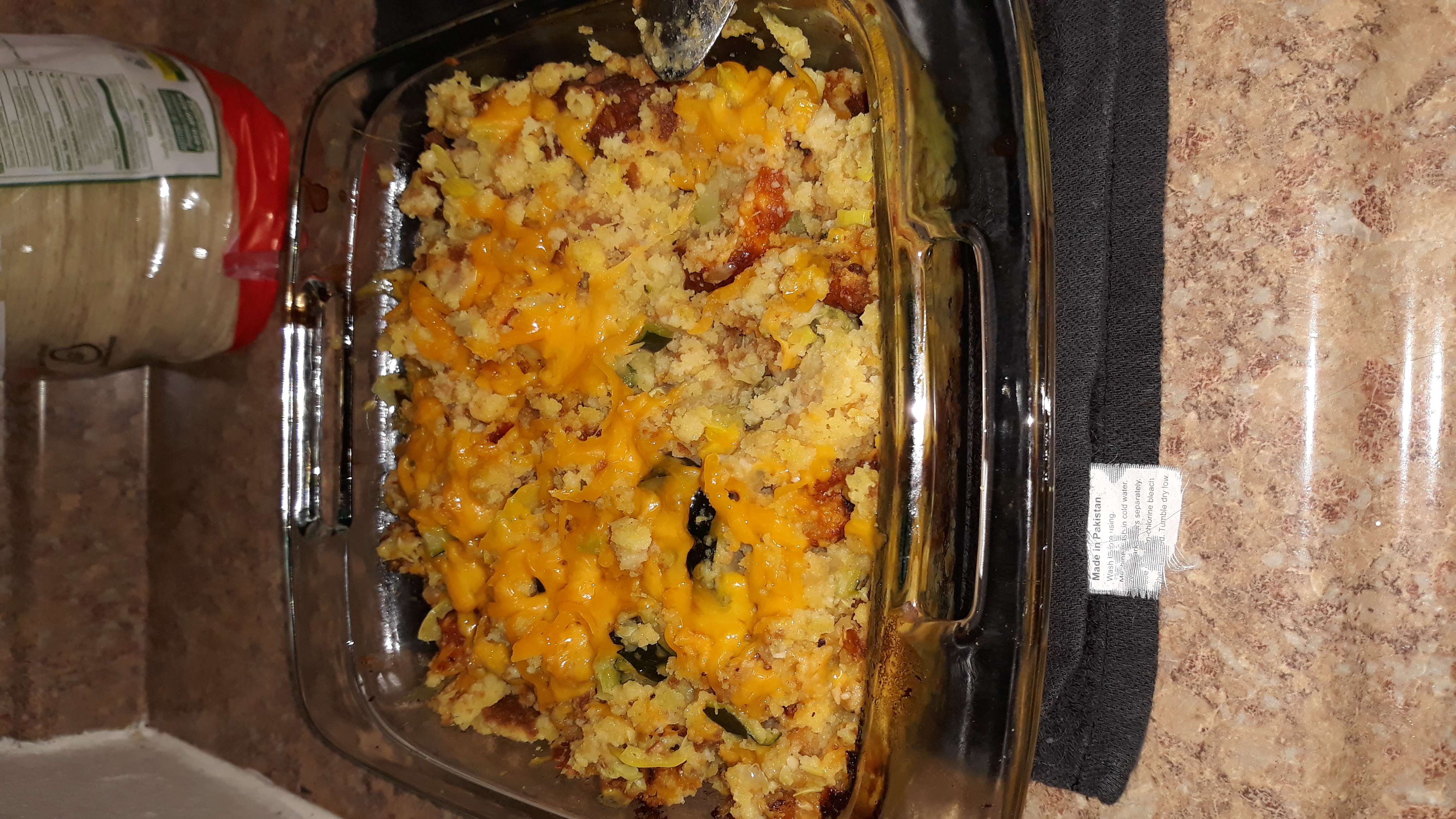 Prepare Jiffy Mix as directed on the box, set aside to cool. Place zucchini and yellow squash in a large saucepan and add just enough of water to cover. Cook on medium low heat just until tender, remove from heat. Drain squash, reserve one cup of water for casserole. On medium low temperature place all of the butter in large sauce pan and saut the onions until the onions turn clear, add salt, pepper, thyme, and parsley. Add chicken bouillon cubes and garlic to onions, stir. Add drained squash and diced cheese, stir. Crumble corn bread in squash and pour the reserved cup of water and mix well. Place squash mixture in a 13x11" baking pan that has been sprayed with a non-stick spray. *This is the point I freeze mine - can also be frozen in 2 small pans if desired. Then all you have to do is thaw when ready and cook! Cover casserole and place in a preheated oven at 350F. Bake for 50-60 minutes. Remove cover the last 20 minutes of baking time. Lower Fat content by reducing amount of butter used by half.