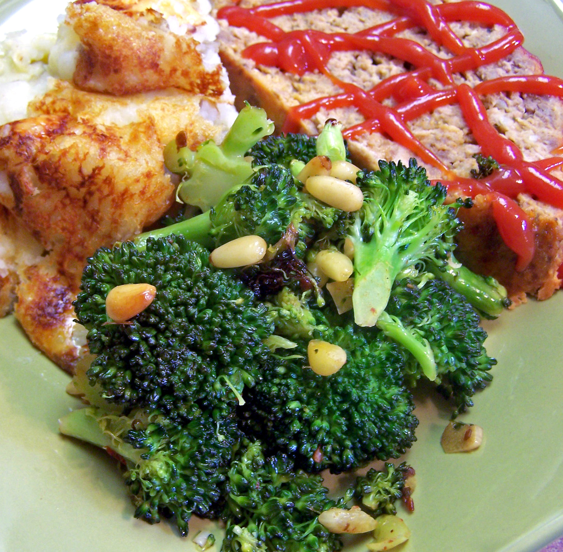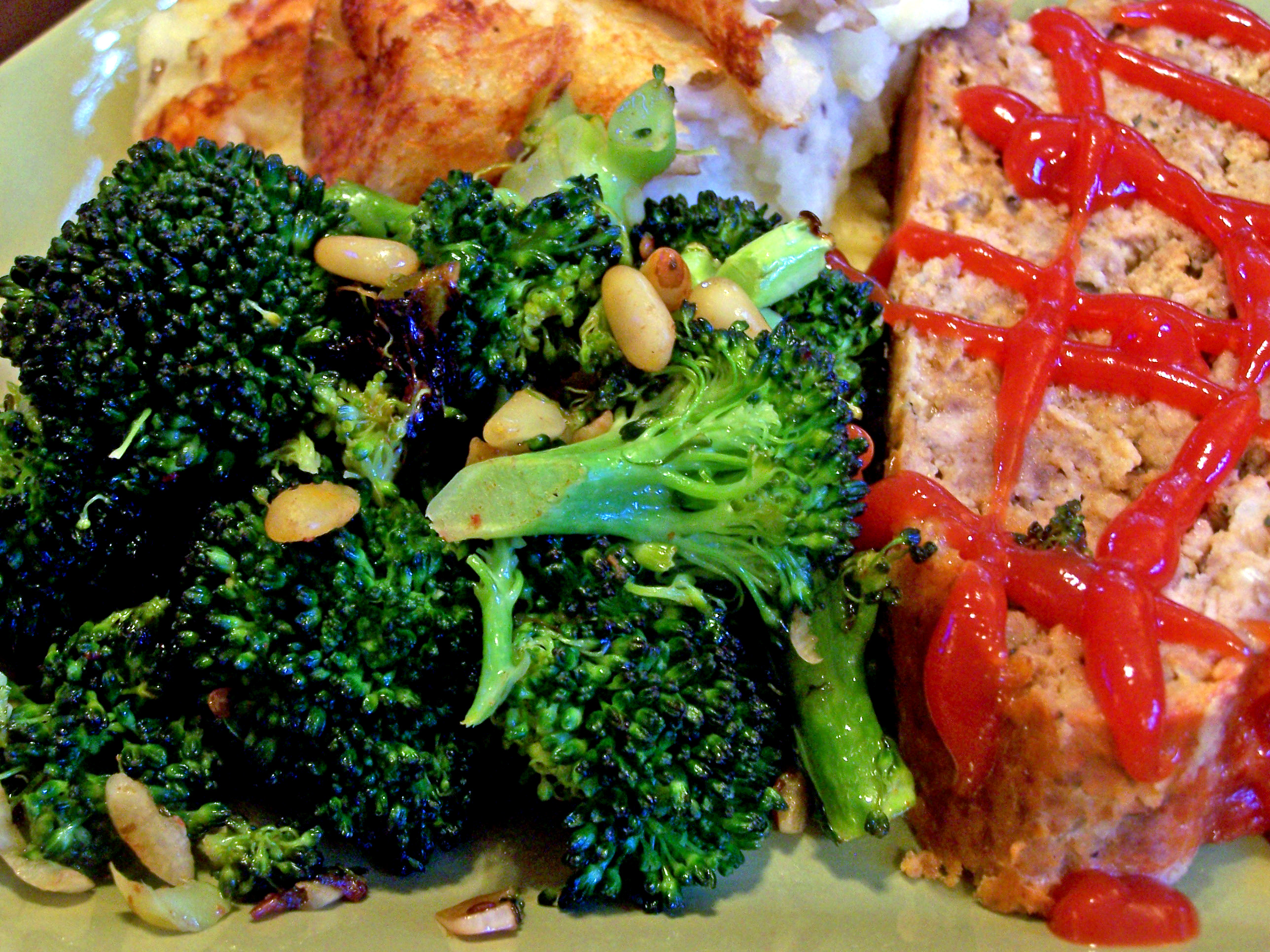 2 lbs broccoli, washed, tough stalks peeled, and rough chopped 1?4 cup olive oil 1?4 teaspoon ground coriander 1 teaspoon seasoning salt, Smokey Seasoned Salt 2 chipotle chiles in adobo, Seeded and minced 5 garlic cloves, minced 1?3 cup pine nuts