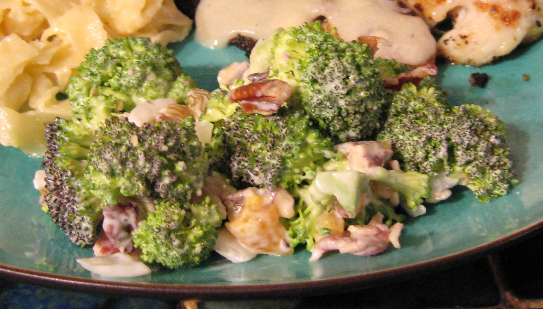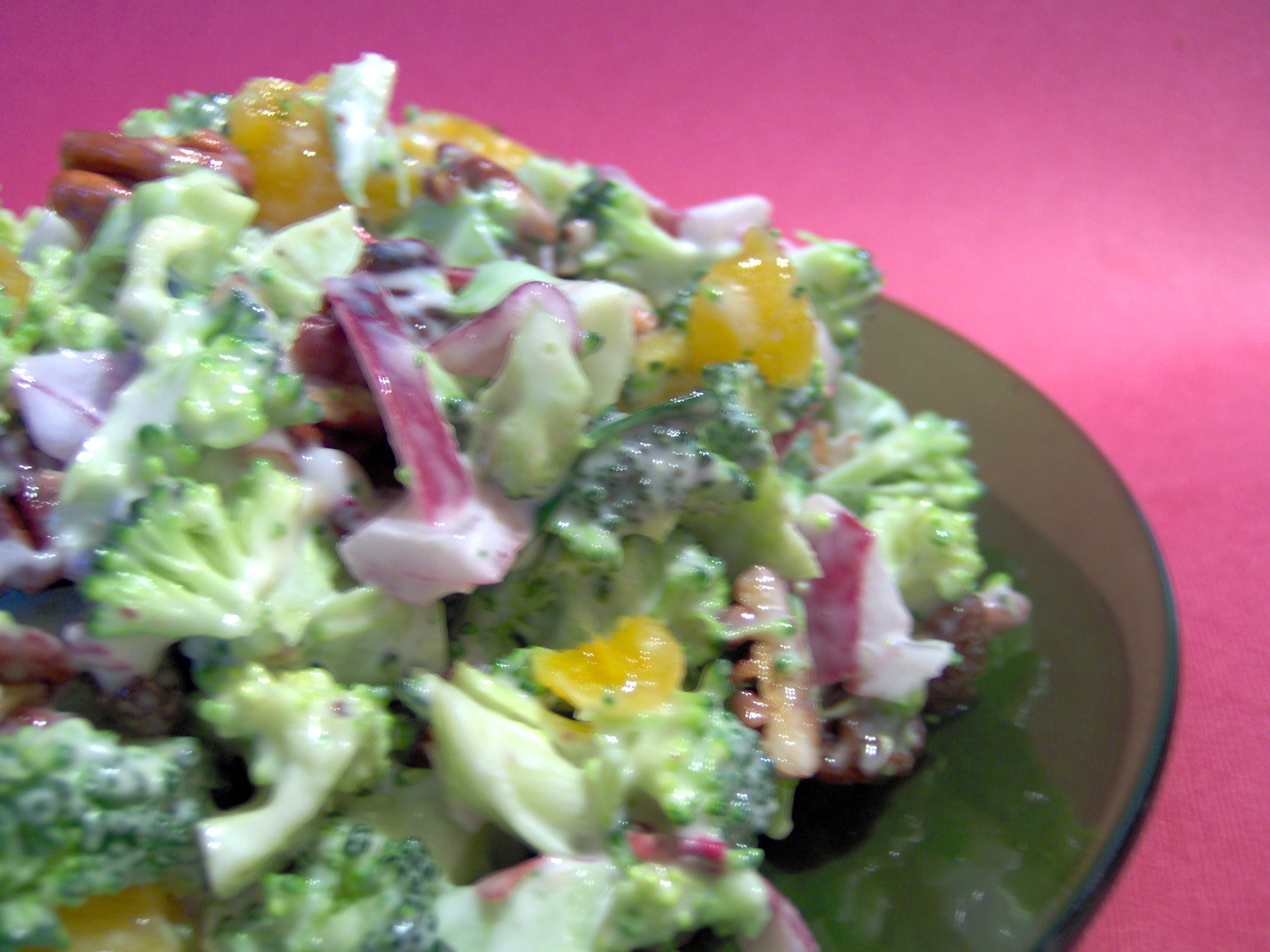 4 cups broccoli, floweretts cut into bite size pieces 1 small purple onion, slices (about 1/2 cup) 1?2 cup raisins 1?2 cup apricot, cut into bite size pieces 1?2 cup toasted pecans 2 -3 tablespoons bacon bits (optional but highly recommended for garnish) 1?4 cup Miracle Whip 1?2 cup mayonnaise 1 tablespoon sugar or 1 tablespoon Splenda sugar substitute 1 1?2 tablespoons rice vinegar