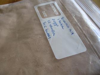 To make the mixing as painless as possible, I often take 1 cup of sugar and blend it with the baking powder, salt, and cocoa powder. This breaks up all the little clumps before you tackle the monster-big bowl of dry ingredients. I've found a whisk to be most helpful for this task. Once you've got a clump-free mixture, mix in the rest of the flour and sugar, being very careful that no pockets of un-mixedness remain. I put mine in quart-sized ziploc bags, 2 1/4 cups per bag. (sandwich bags can be used, but they don't come in the heavy-weight freezer-caliber plastic -- the last thing I want all over my pantry is a batch of brownie mix. Also, the freezer weight has a label on it already) Label each bag with the recipe which is as follows: 1 bag of brownie mix, 2 eggs, 1 teaspoon vanilla, and 1/4 cup melted butter or margarine. Blend well (mixture will be very thick). Add 1/2 cup chopped walnuts if desired (I've never tried the walnuts due to allergies). Pour mixture into a cooking-sprayed 8x8" inch pan. Bake at 350F for 30-35 minutes. For a very fudgey brownie, turn the heat down to 325F and cook for 35 minutes, until a toothpick tests clean. Be sure to refrigerate extra-fudgy brownies. To serve, I cut 1/4" off of each side (while still in the pan) and remove the "brownie sticks" before cutting and removing individual pieces. My family loves the brownie sticks, and the serving pieces are much more clean. Store them covered. These brownies never need frosting (in my opinion) and make a great source for emergency chocolate.