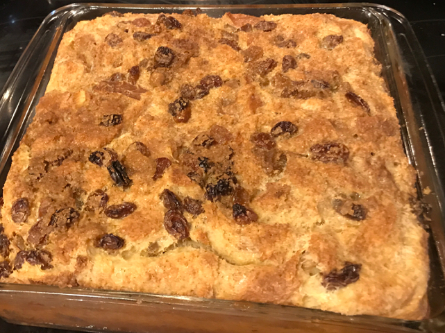 1?2 cup raisins 1?2 cup brandy or 1/2 cup water 1?4 cup butter or 1/4 cup margarine, melted 8 -10 slices dry bread 1 cup packed brown sugar 1 teaspoon cinnamon 1?4 teaspoon allspice 3 eggs 1?4 teaspoon salt 1 teaspoon vanilla 3 cups milk, scald & cooled