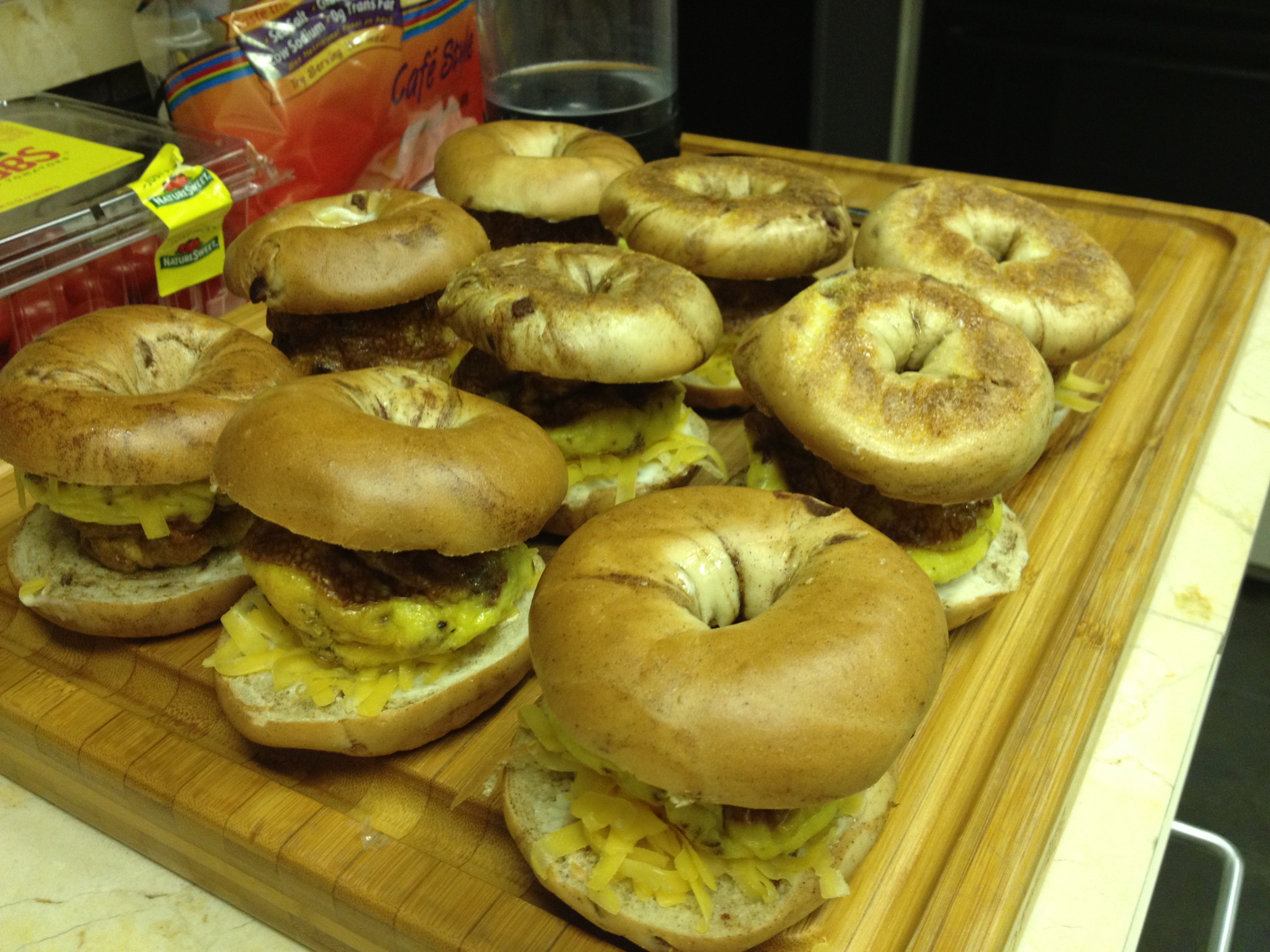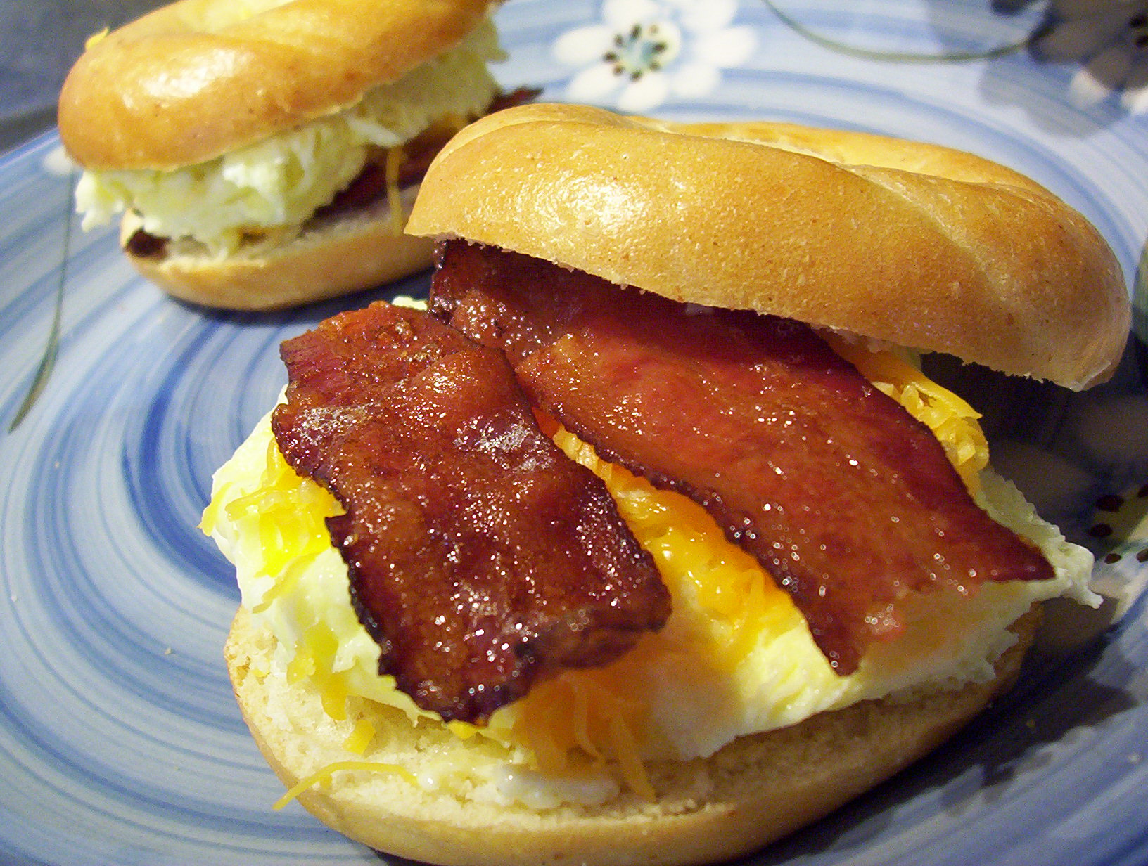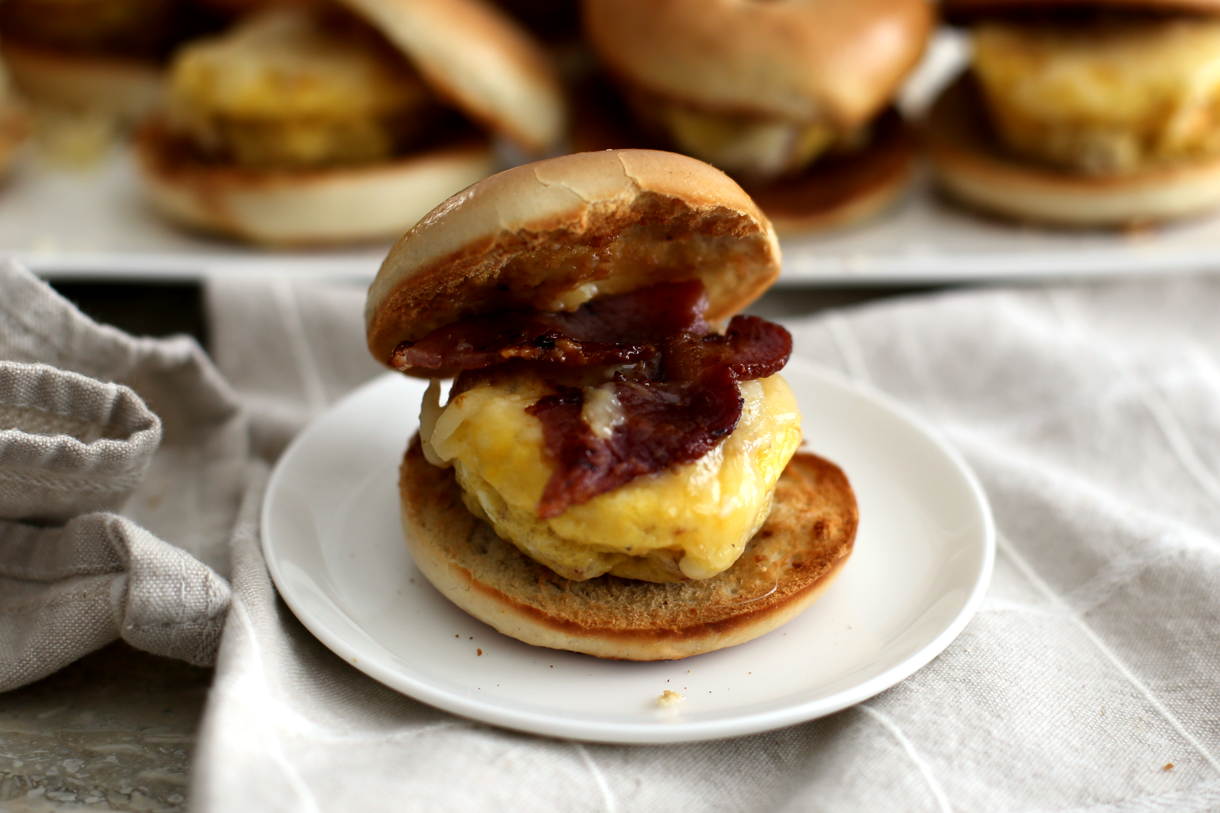 12 miniature bagels (whole wheat or white) 1?2 cup butter 12 pieces bacon (fried crisp and cut in half) 12 eggs 1 cup cheddar cheese, grated (or your favourite kind)