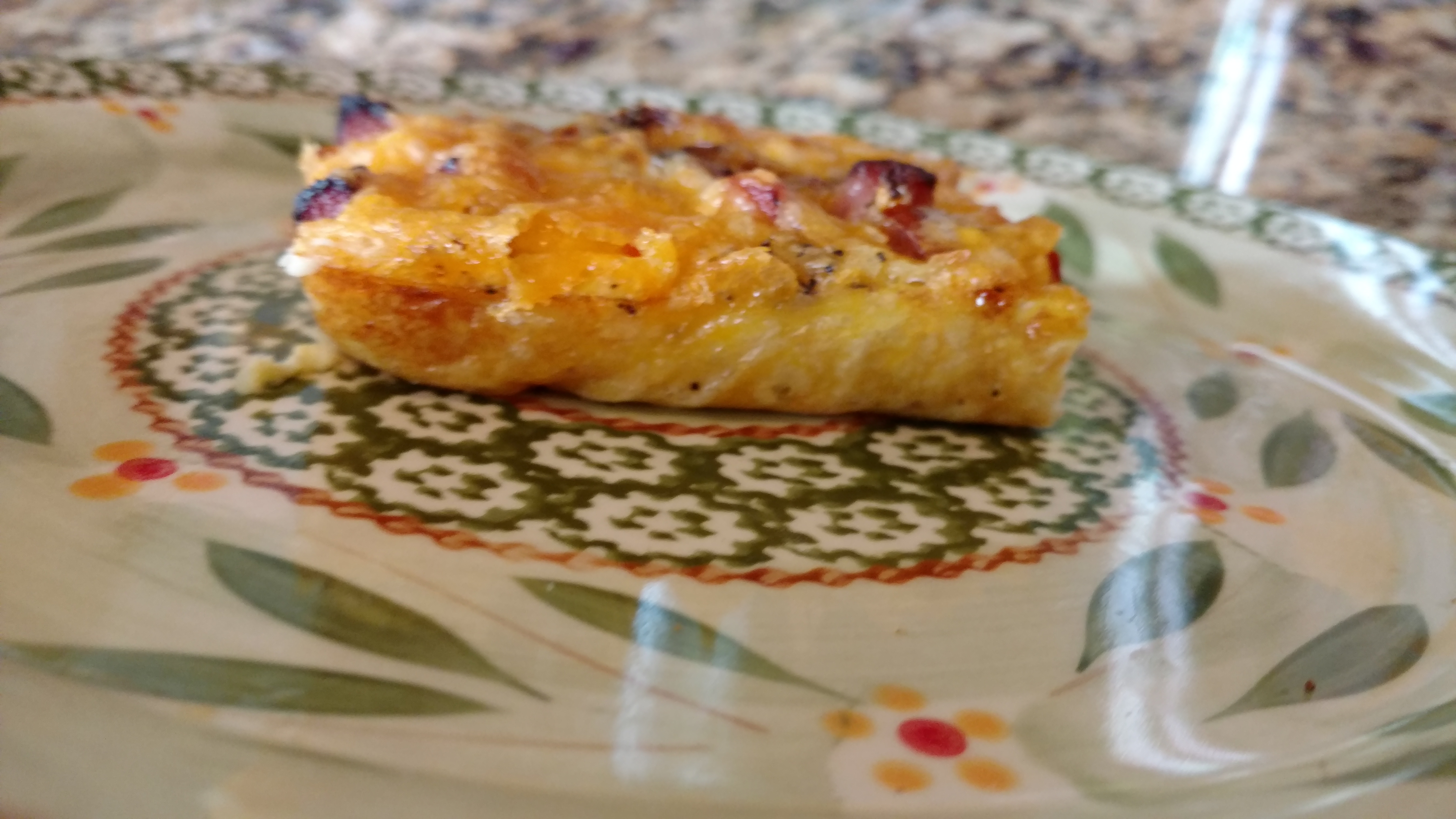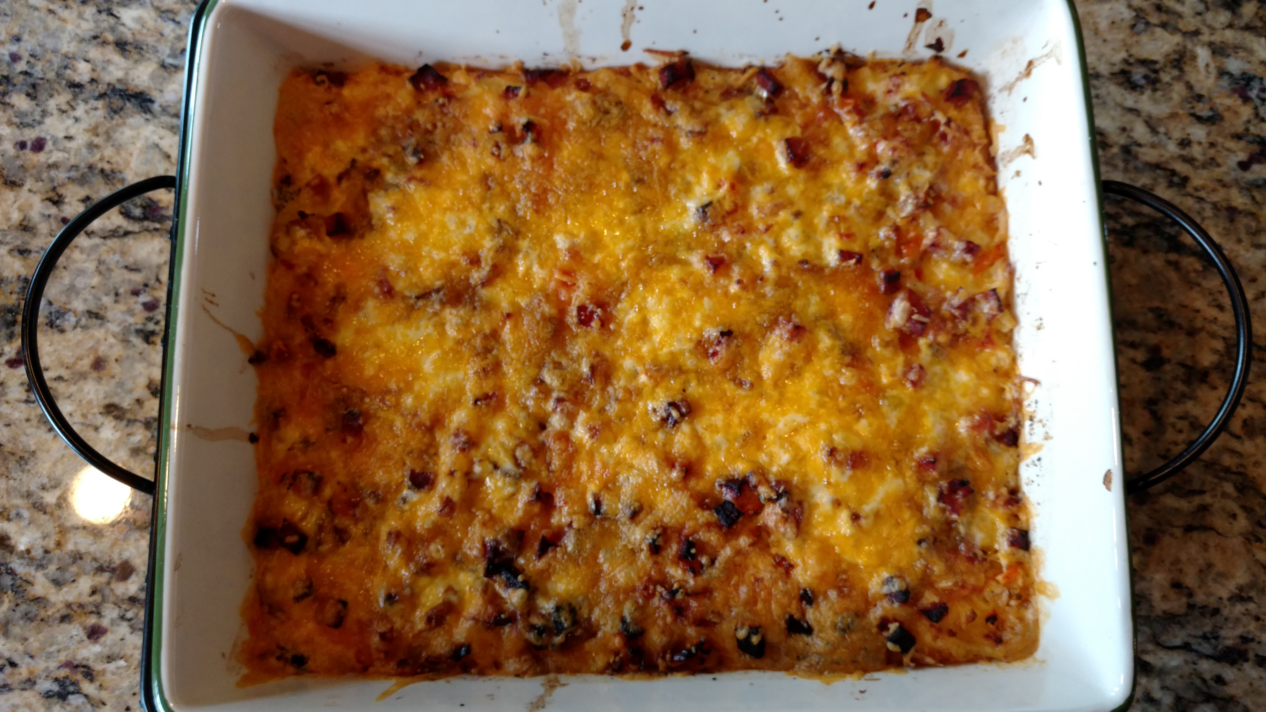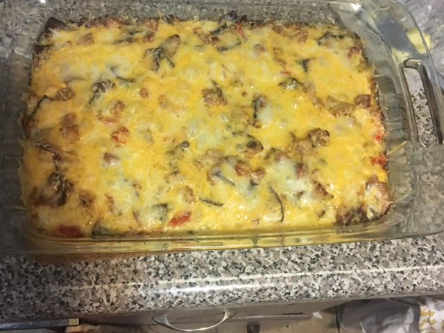 Melt margarine and place in the bottom of 9" by 13" baking pan. Spread potatoes (still frozen is okay) in bottom of the pan. Sprinkle chopped vegetables over potatoes. Add salt and pepper to taste. Sprinkle meat over potatoes and vegetables. Note: At this point you may continue or casserole may be refrigerated overnight. Pour beaten eggs over potatoes. Bake at 350 degrees for 45 minutes. Remove from oven and sprinkle cheese evenly over top. Bake another 5-10 minutes or until cheese is hot and bubbly. Remove from oven and let set for approximately 5 minutes. Cut into 2.5"-3" squares and serve with a spatula. Enjoy.