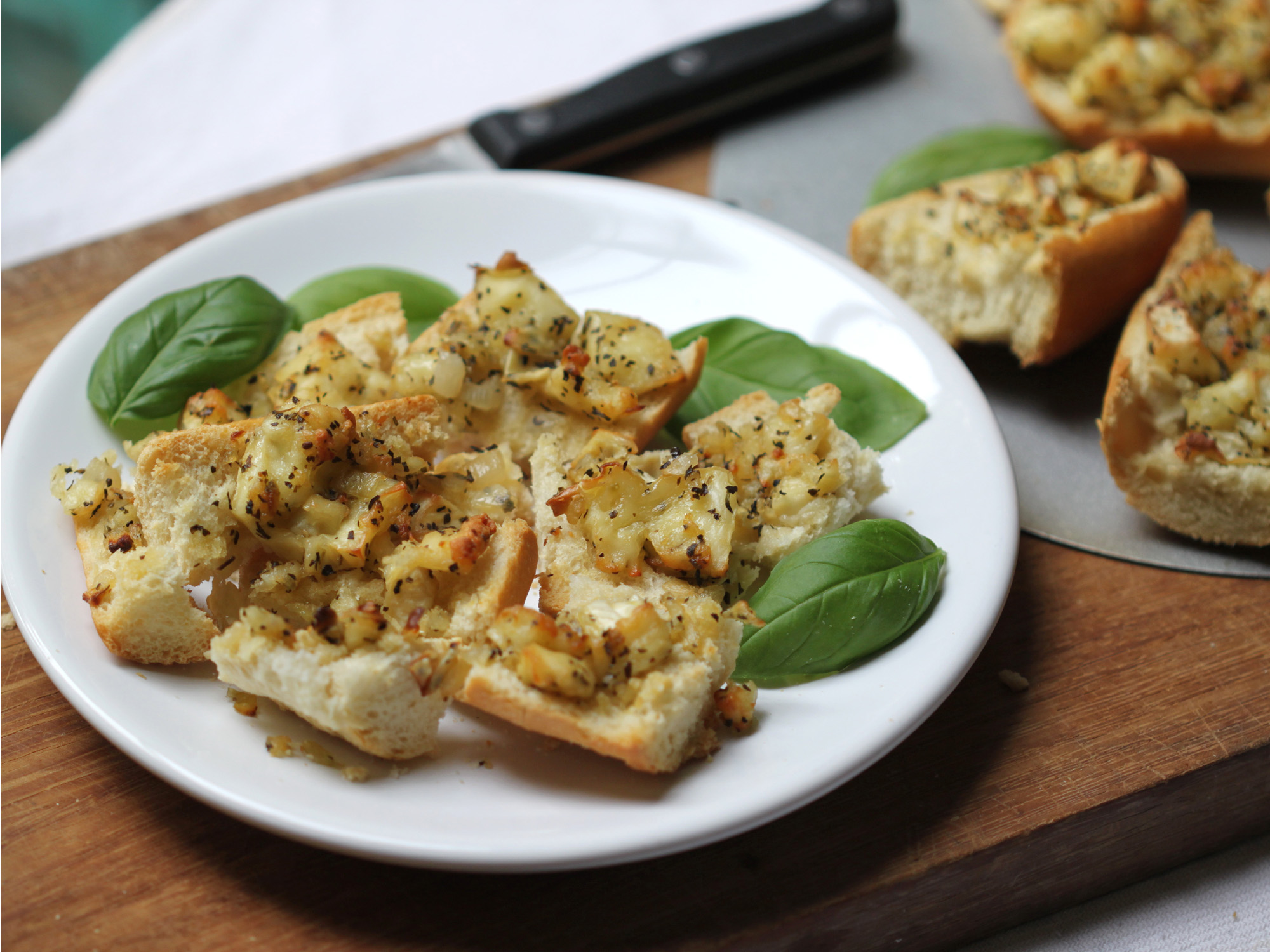 Melt the butter in a sauce pan and onion and basil. Cut the Brie into small pieces and add to the butter mixture. Stir until the Brie is melted. Slice the French Bread in half lengthwise. Take each half and cut ALMOST all the way through into slices about 1 1/2 inches each. Spread the melted brie mixture over each half of the loaf. Note: At this point you can refrigerate the bread/brie and continue just before serving. Place each half of the under the broiler until the cheese is bubbly. Tear the individual pieces completely off the loaves and place on serving platter.