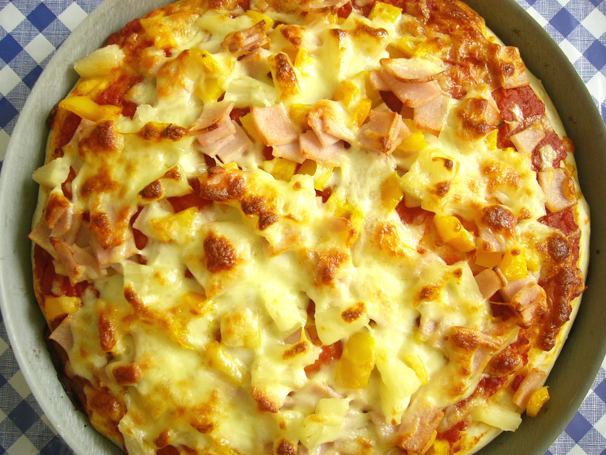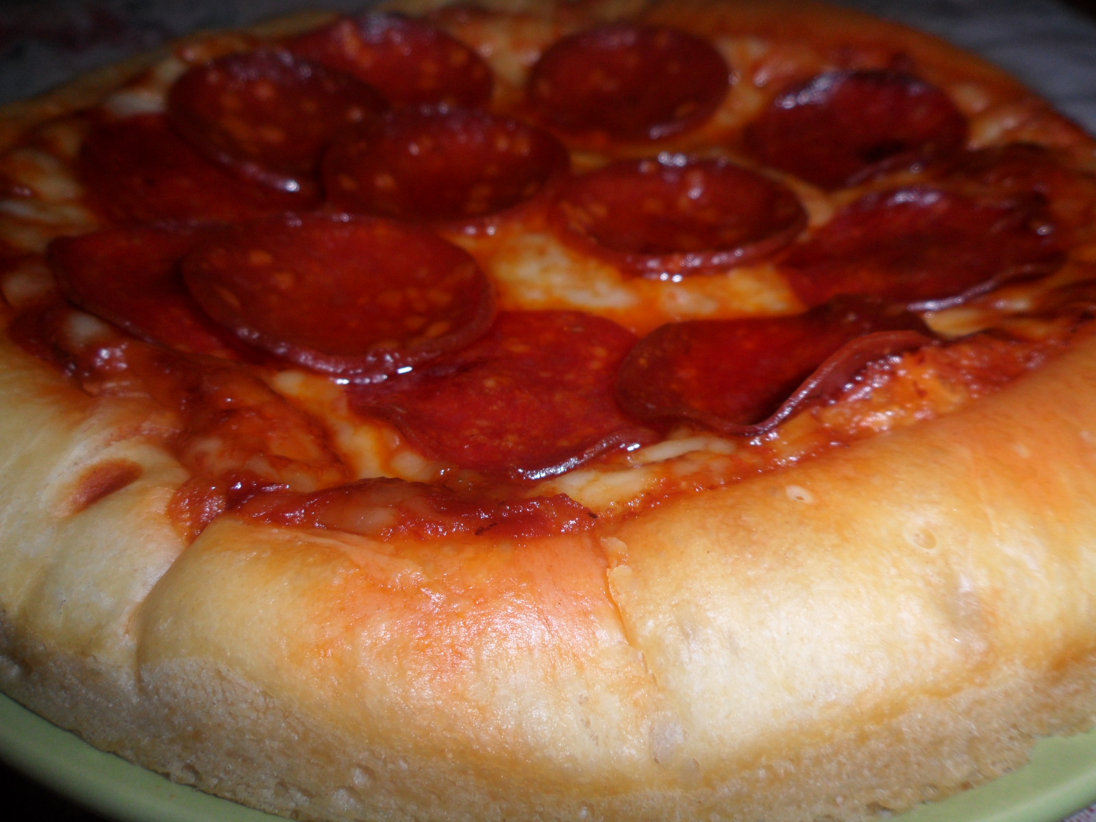 Add ingredients in the order reccommended for your bread machine and set to dough cycle. After it's finished, transfer dough to lightly oiled pan. For a thick crust, cover and allow to rise for about 20 minutes; for thin, bake right away. Heap with toppings of your choice and bake in 450F oven for about 20 minutes (I sometimes put the crust in for about 5 minutes before adding toppings to speed it up a little bit and to prevent a soggy crust). Enjoy!