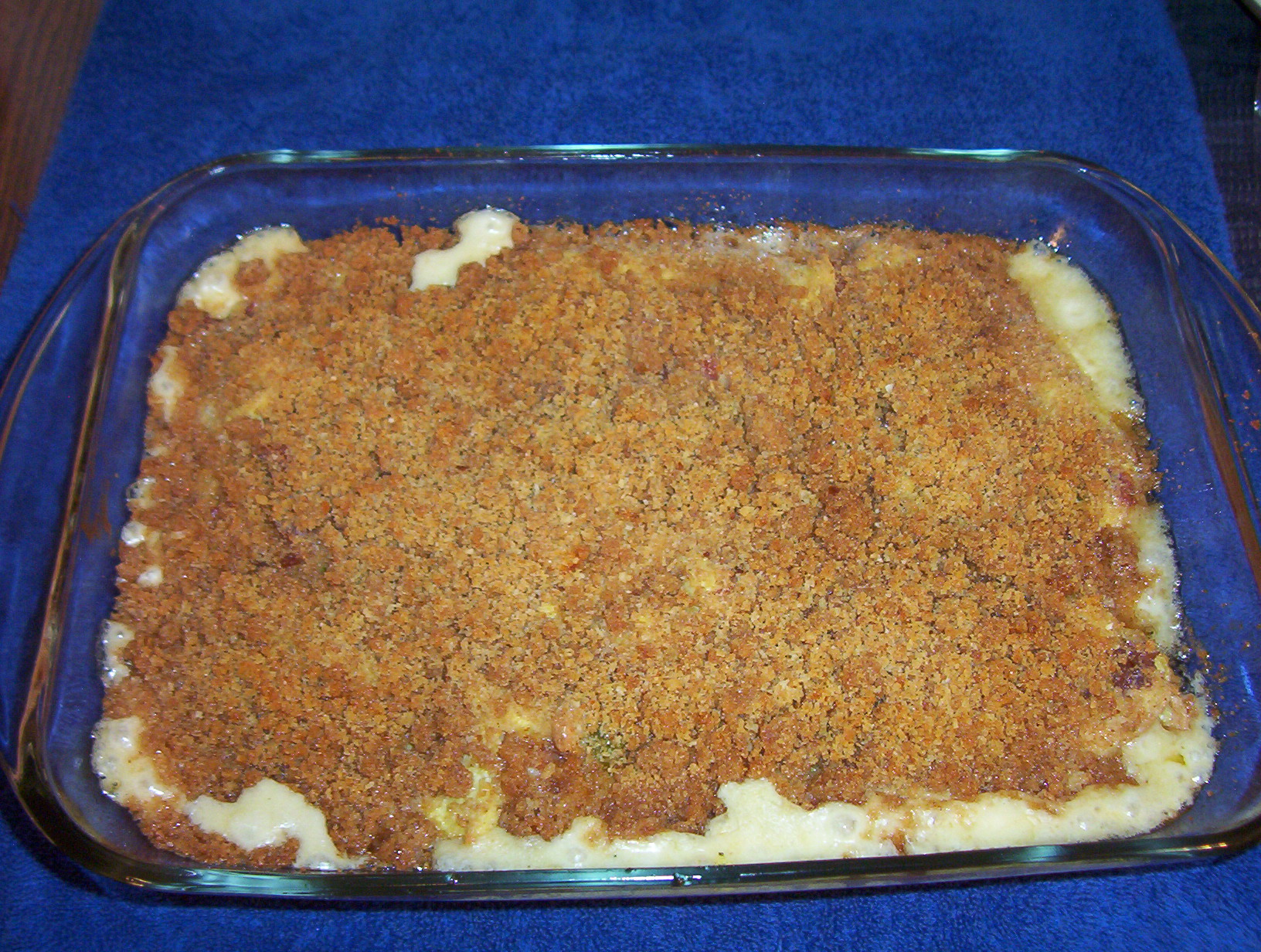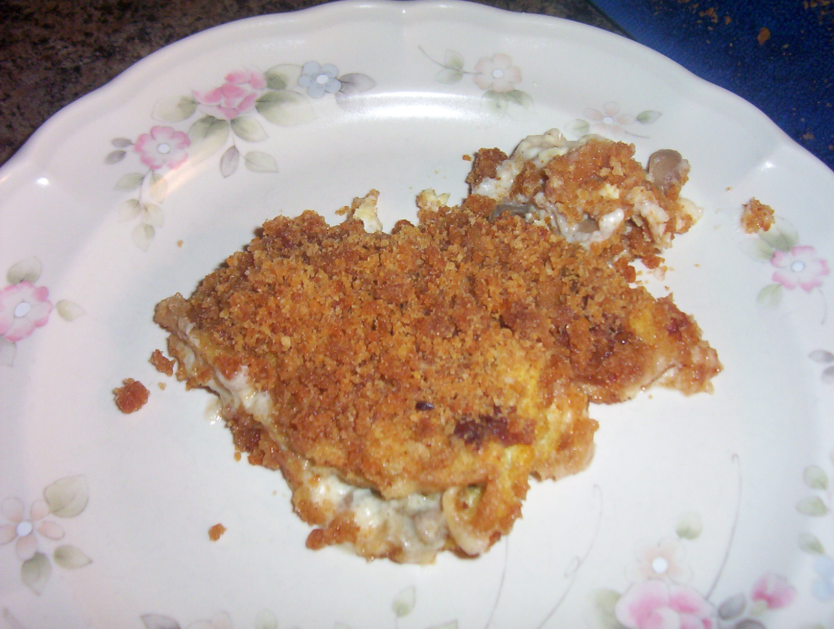 Melt butter. Blend in flour and pepper. Gradually add milk and stir until thickened. Add cheese; mix and set aside. Fry bacon and onions until browned. Add eggs and scramble just until set. Add mushrooms and cheese sauce and put into a greased baking dish (9x13-inch). Mix breadcrumbs with 3 tablespoons melted butter and paprika; sprinkle over egg mixture. Chill for 30 minutes at least OR put in fridge overnight. To serve, bake for 30-minutes in a 350F oven.