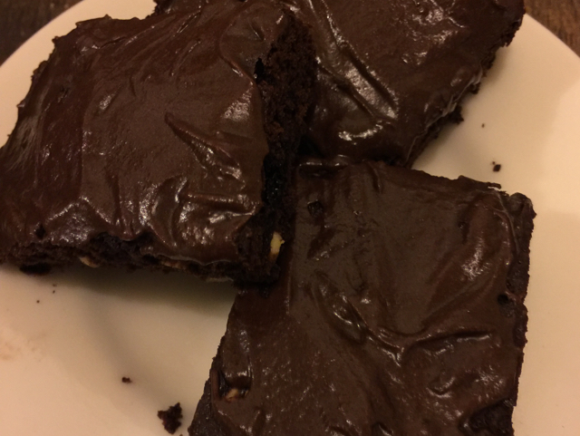 The first 3 ingredients cook over a stove on medium heat, till margarine melts. Remove from heat, add the eggs and vanilla. Then add the remaining ingredients. Stir in the walnuts. Put in a greased 8 inch squared pan, bake at 350 for 25 minutes. I make a double batch. Cocoa Glaze: Combine icing sugar, and cocoa powder. Beat in margarine, add 1-2 tbsps of boiling water to make a smooth glaze.