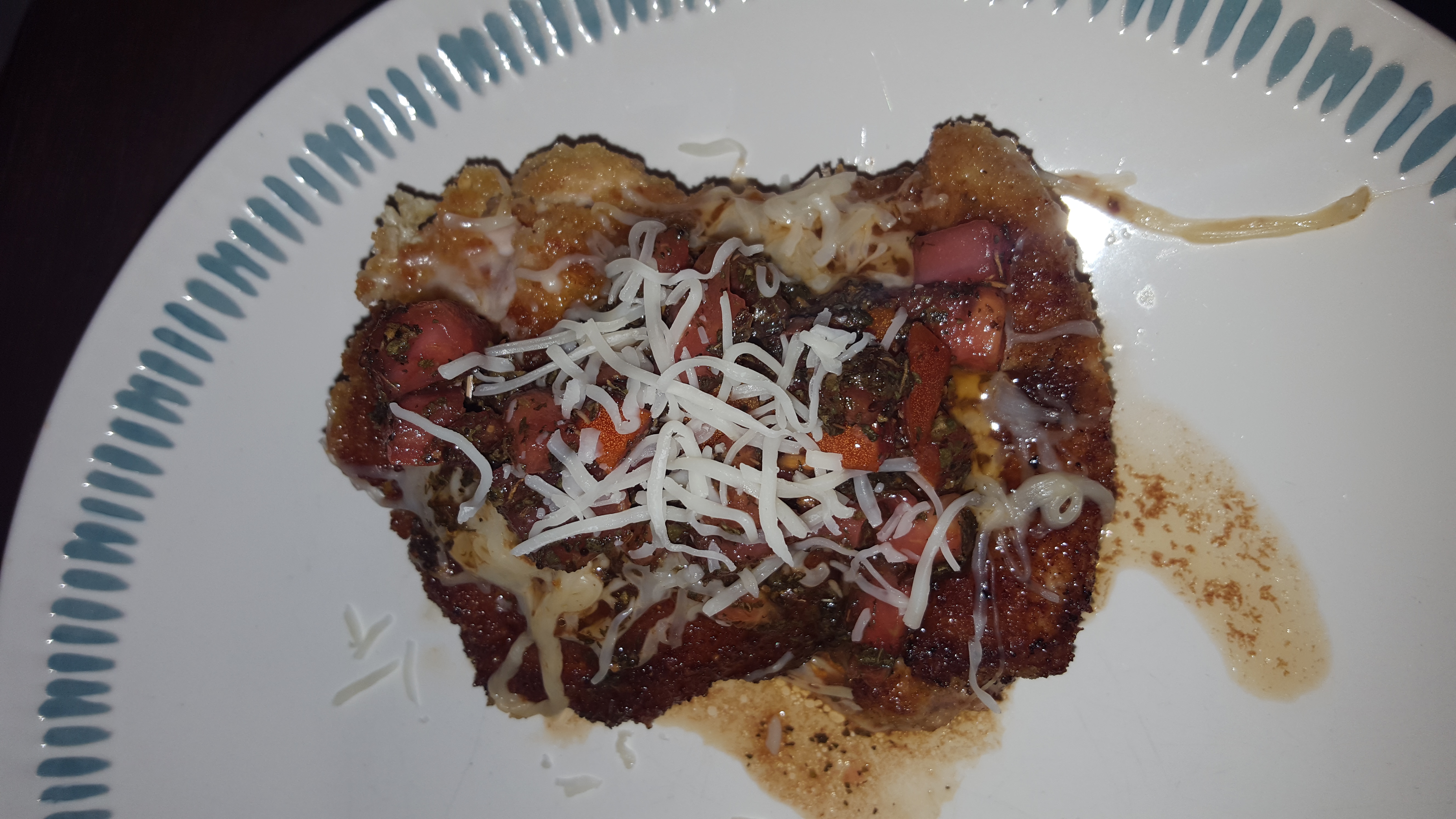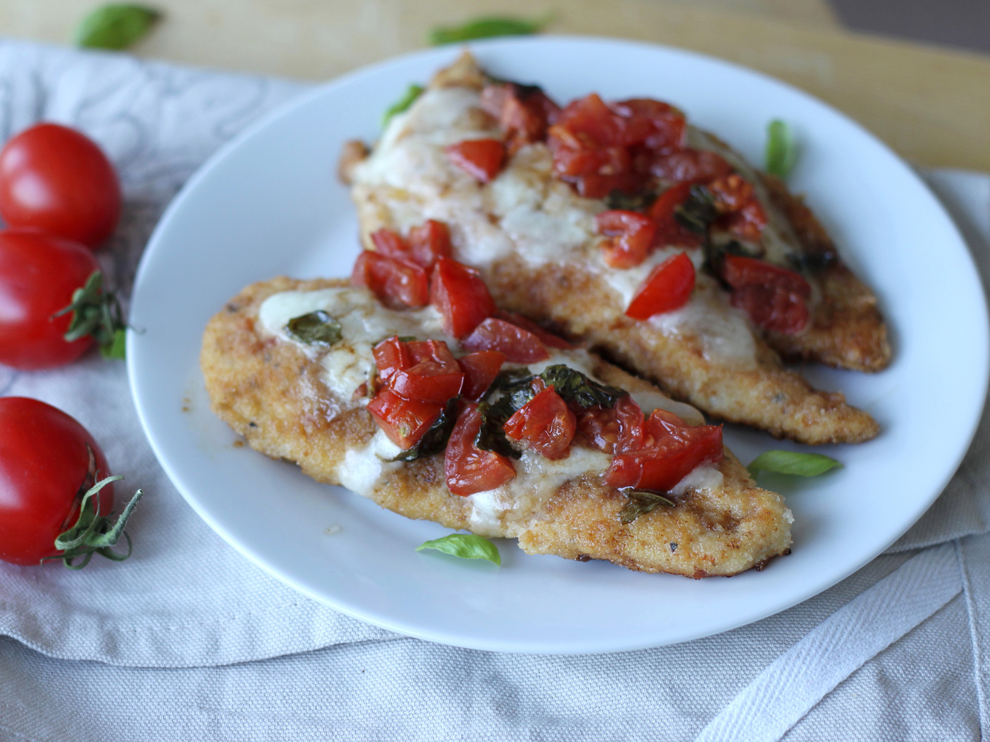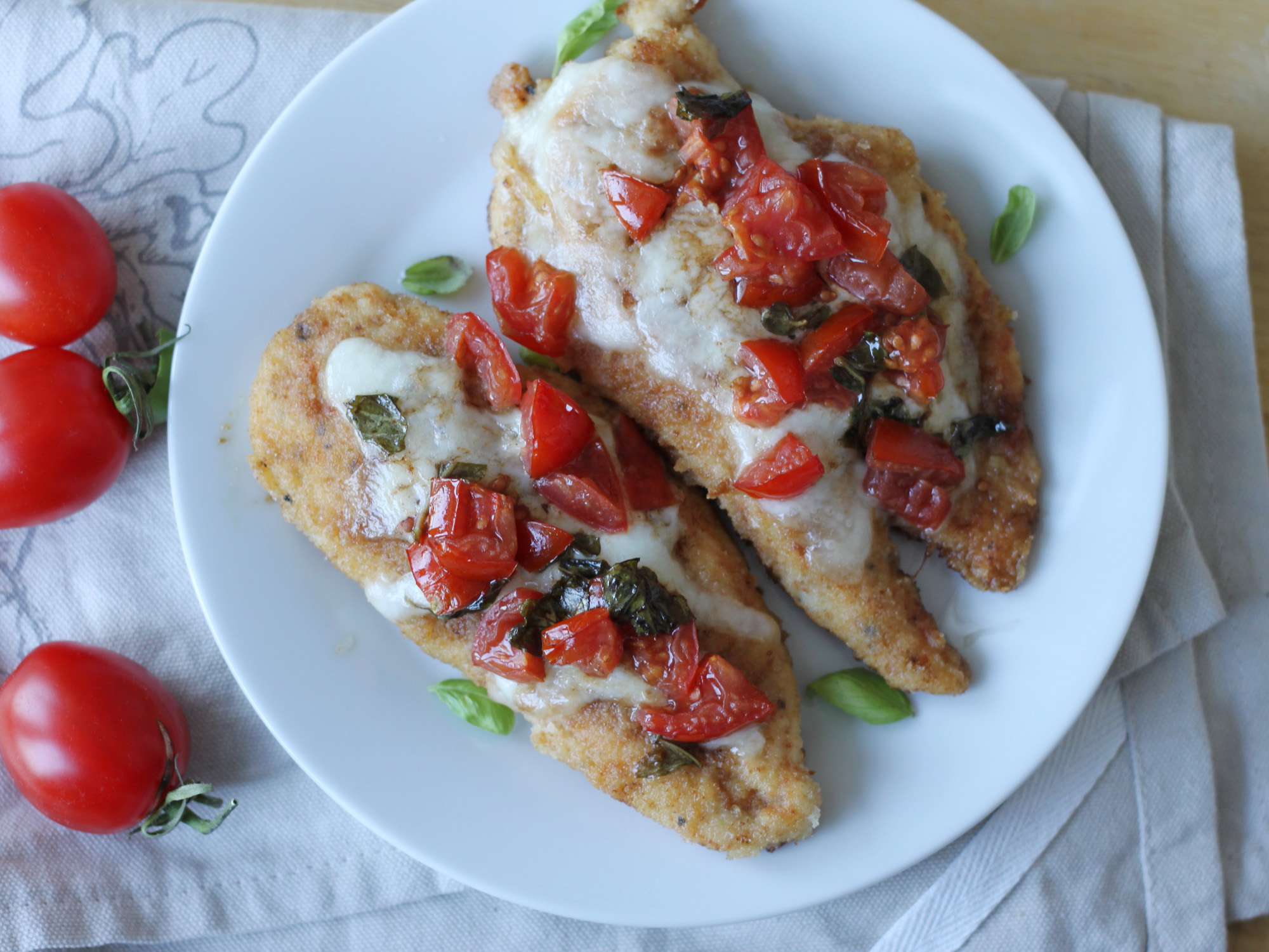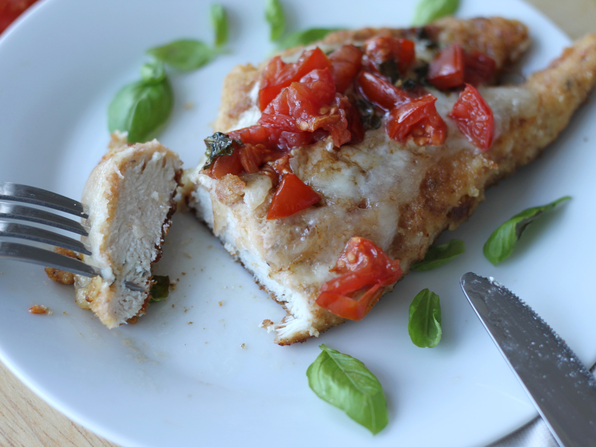 1 lb chicken breast, boneless and skinless cut into serving pieces and pounded 1/2-inch thick 1 large egg, lightly beaten 1?2 cup breadcrumbs 3 tablespoons vegetable oil 3 tablespoons olive oil 2 teaspoons balsamic vinegar 2 tablespoons fresh basil, chopped 1?8 teaspoon garlic powder 1?8 teaspoon onion salt 1 large tomatoes, chopped salt, to taste pepper, to taste mozzarella cheese, shredded for topping