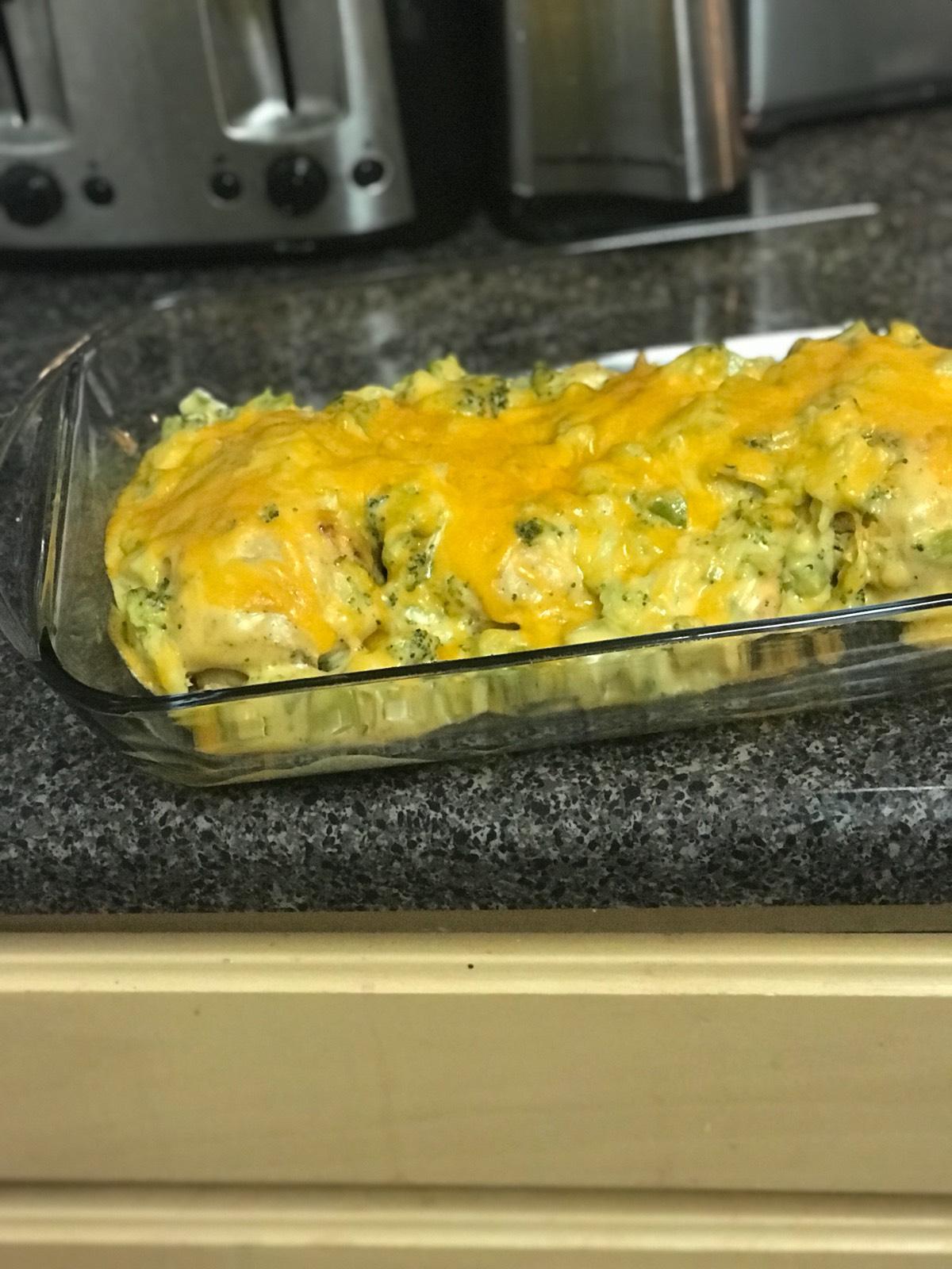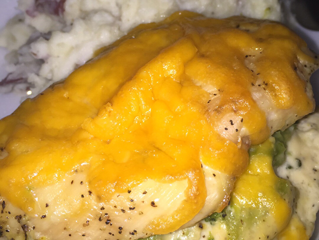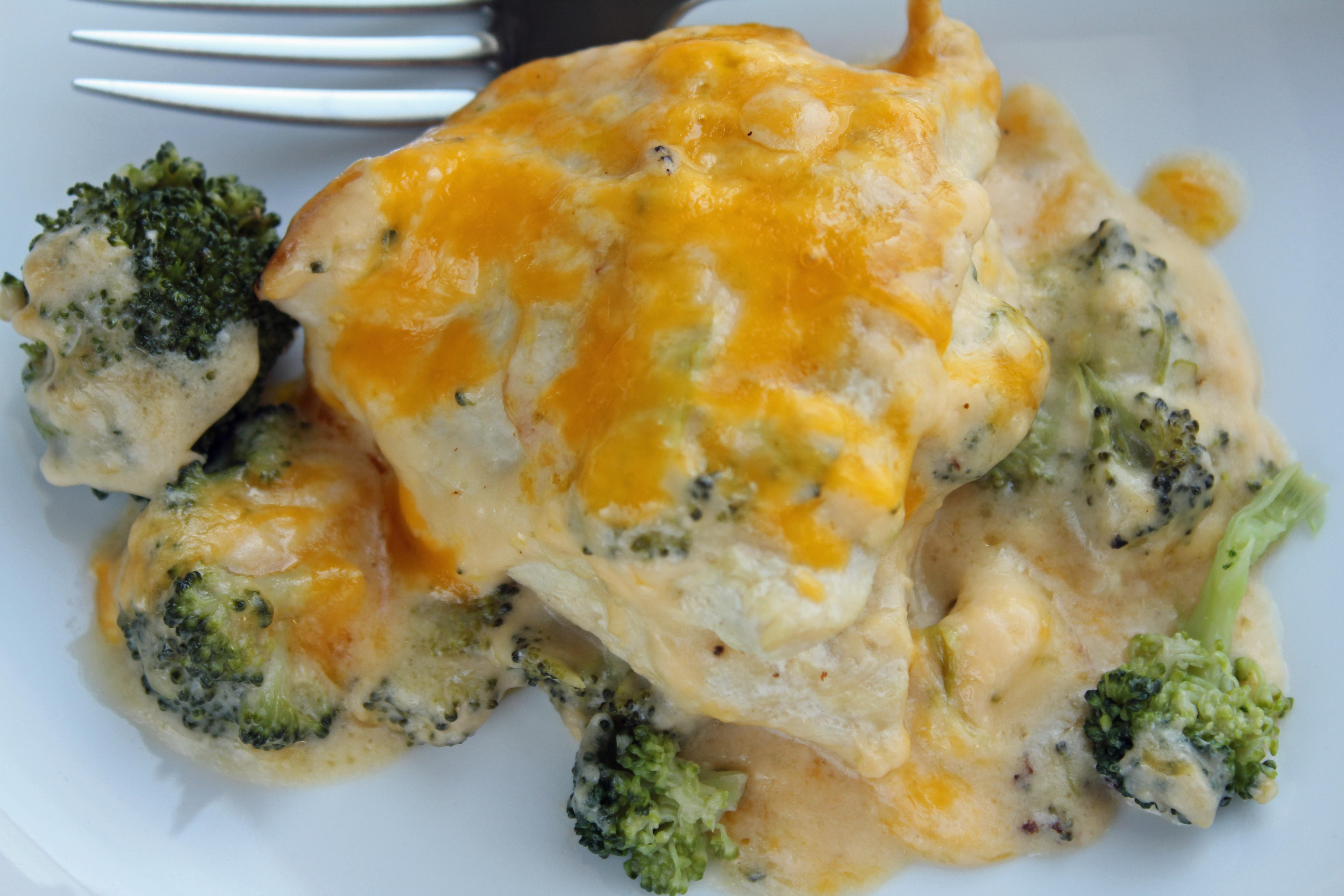 2 boneless skinless chicken breasts, cut in half and butterflied (sliced through the middle-but not all the way through, to make a pocket) 1 1?2 cups steamed broccoli 2 tablespoons butter 2 tablespoons flour 1 cup milk 1?2 cup shredded cheddar cheese (or cubed Velveeta for a smoother sauce) 2 tablespoons cream cheese 1?2 cup shredded cheddar cheese (not a typo, another 1/2 cup) salt and pepper garlic powder