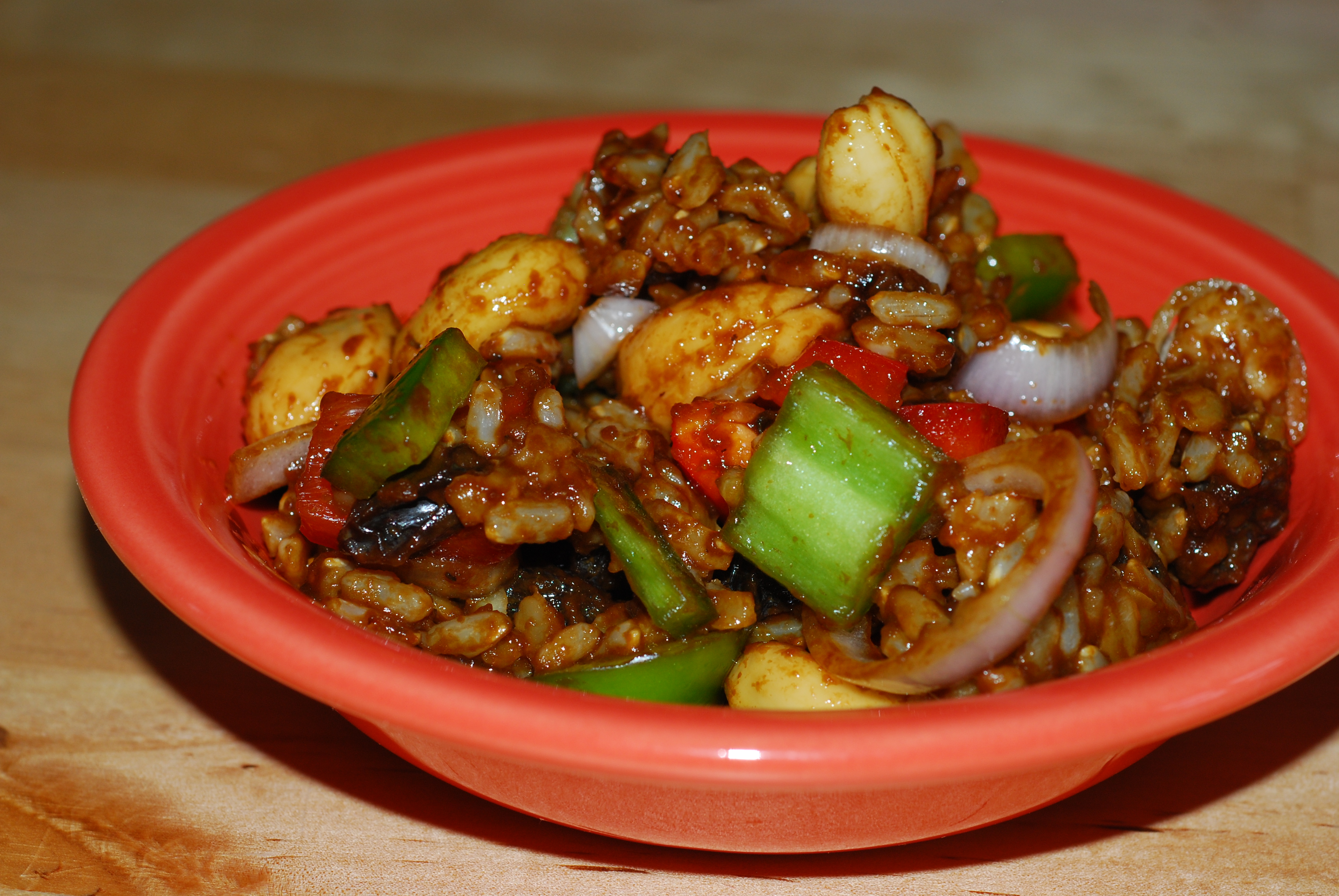 FOR THE SALAD 1 1?2 cups brown rice 1 red capsicum, chopped (red bell pepper) 1 green capsicum, chopped 3 spring onions, chopped 1?2 cup raisins or 1/2 cup sultana 1?2 cup cashews or 1/2 cup peanuts FOR THE DRESSING 1?2 cup olive oil 2 tablespoons soya sauce 1 crushed garlic clove black pepper