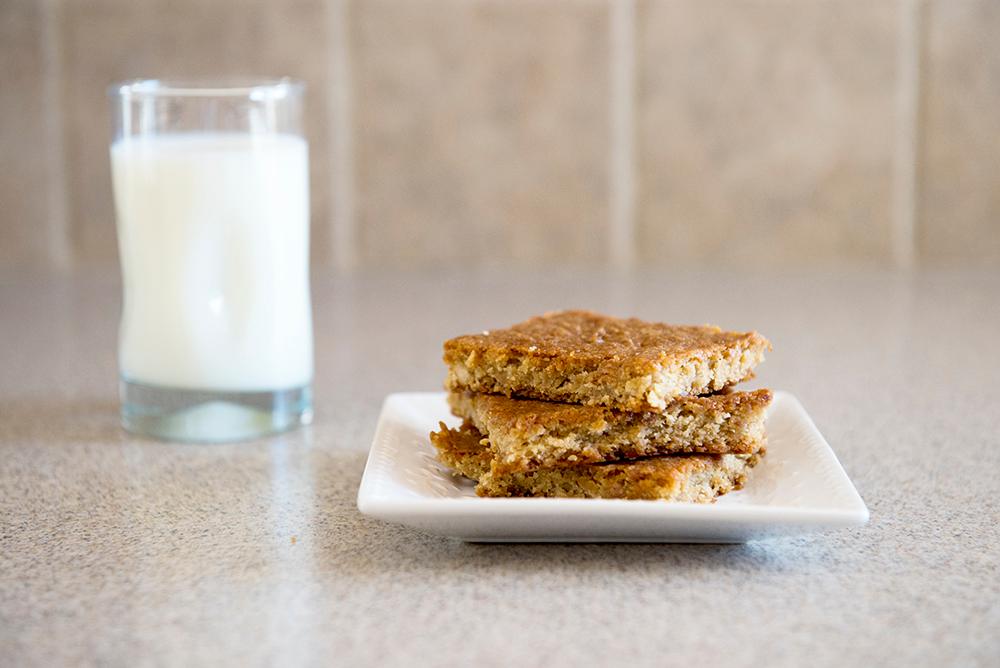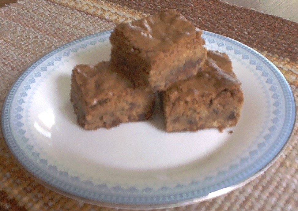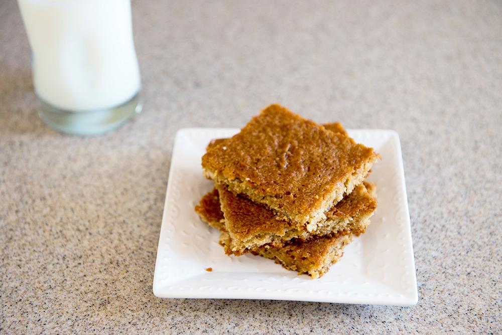 Mix all ingredients well. Bake in 9 inch square pan that you have sprayed well with Pam at 350F for 25 to 30 minutes. Cool before cutting.