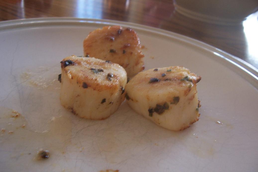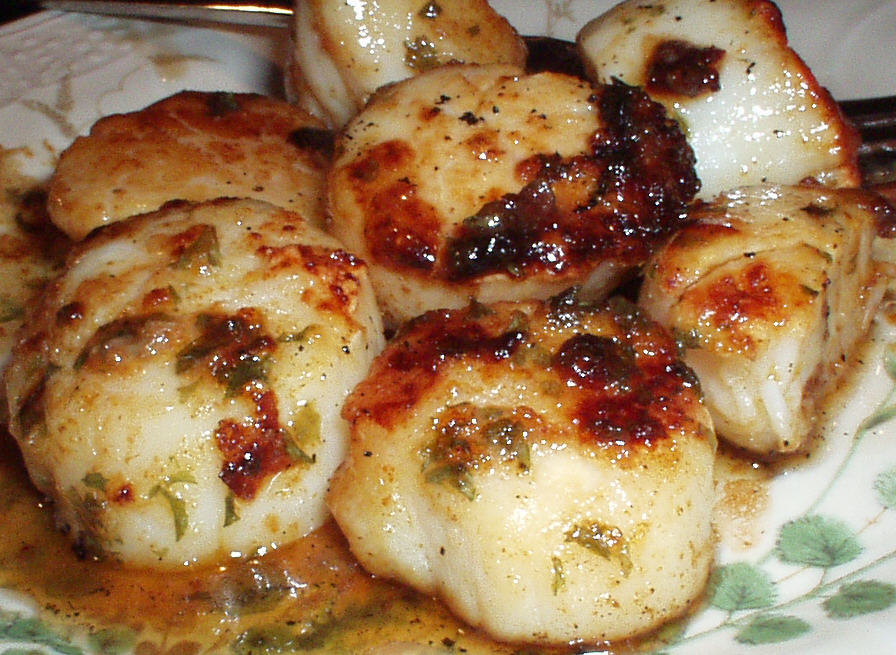 10 scallops 1 tablespoon unsalted butter or 1 tablespoon margarine 1 tablespoon olive oil 1 dash garlic powder 1 dash onion powder 1 dash paprika chives parsley