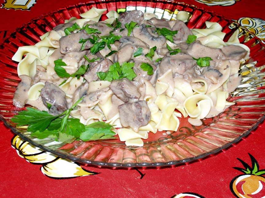 Combine flour, salt, thyme and pepper in plastic bag. Add meat and shake well. Remove meat, shaking off excess flour. Melt cup butter in large skillet over medium heat, add meat and brown lightly, about 3 minutes. Add onion and stir until translucent, about 3 minutes. Pour in broth and wine and simmer until meat is tender, about 30-45 minutes. Melt 2 tblsps butter in small skillet over medium heat. Add mushrooms and saut until just tender, 3-4 minutes. Stir mushrooms into meat. Blend sour cream, tomato paste and Worcestershire Sauce in small bowl. Slowly turn into meat; do not allow to boil. Mound noodles on serving platter. Spoon meat over. Top with parsley.