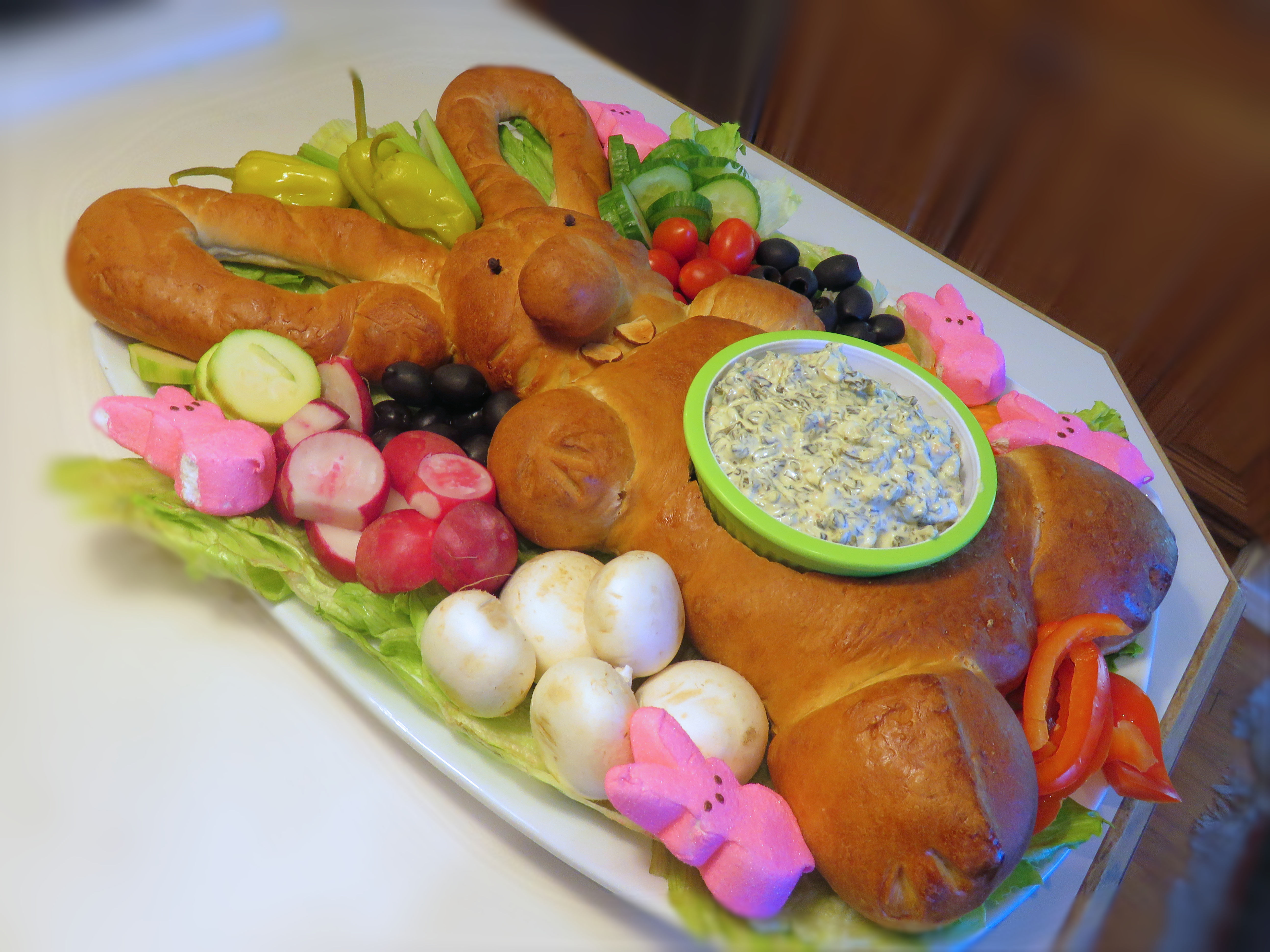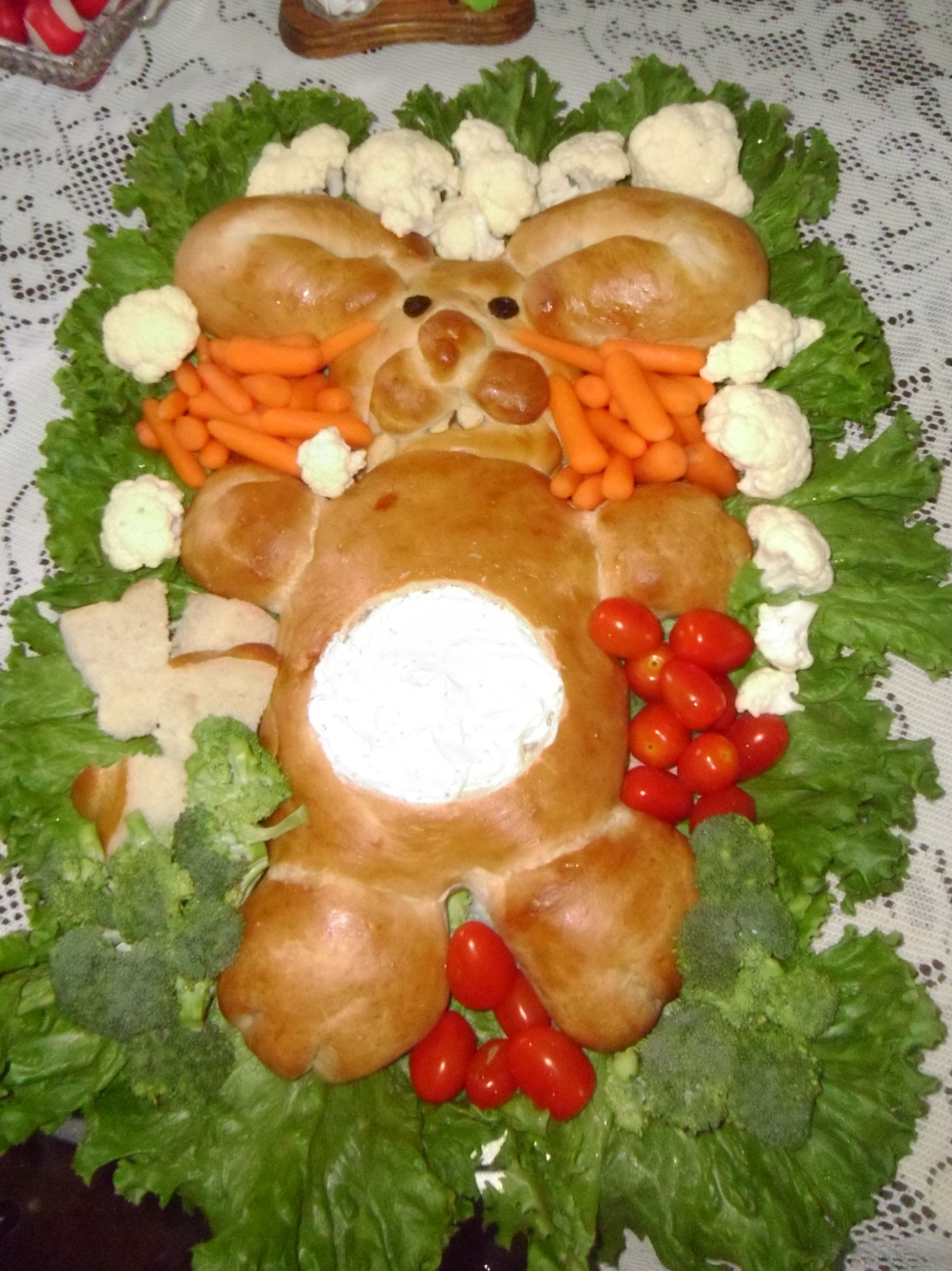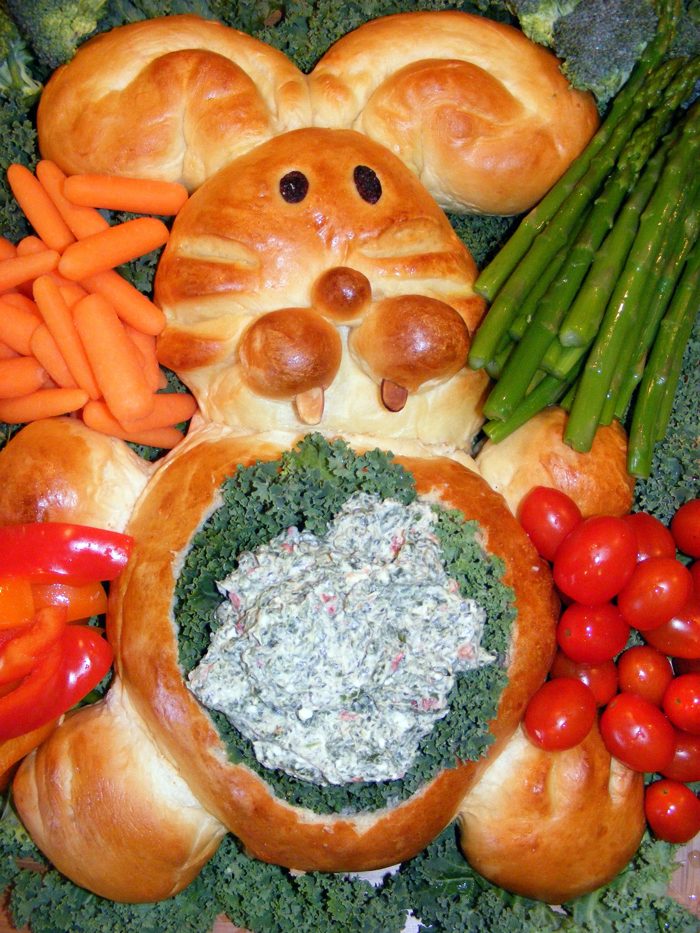 Cut a fourth off of one loaf of dough; shape into a pear to form head. For body, flatten remaining portion into a 7x6" oval; place on a greased baking sheet. Place head above body. Make narrow cuts, about 3/4" deep, on each side of head for whiskers. Cut second loaf into 4 equal portions. For ears, shape 2 portions into 16" ropes; fold in half. Arrange ears with open ends touching head. Cut a third portion of dough in half; shape into a 3 1/2" oval for back paws. Cut two 1" slits on top edge for toes. Position on each side of body at bottom. Divide fourth portion of dough into 3 pieces. Shape two pieces into 2 1/2" balls for front paws; shape the remaining piece into two 1" balls for cheeks and one 1/2" ball for nose. Place paws on each side of body at top of body. Place cheeks and nose on face. Add raisins for eyes and almond for teeth. *You can secure cheeks and nose with pieces of toothpick to hold in place. You can also use a halved white jelly bean instead of the almonds if desired. *Do not use the jelly bean though until just before serving, or it will melt a little and get grainy. (So place the teeth on just before serving.). Brush dough with egg. Cover and let rise for about 30-35 minutes or til doubled. Bake at 350 for 25-30 minutes til golden brown. Remove to a wire rack to cool. Place bread on a lettuce-lined 16x13" tray. Cut a 5x4" oval in center of body. Hollow out bread leaving a shell. Cut bread into cubes for dipping. Line hole in belly with lettuce leaves, fill with dip. Surround entire bunny with bread cubes, fresh veggies and crackers for dipping. *That is to be 2 (1 lb.) loaves of bread dough, there must be a glitch because it won't go through!