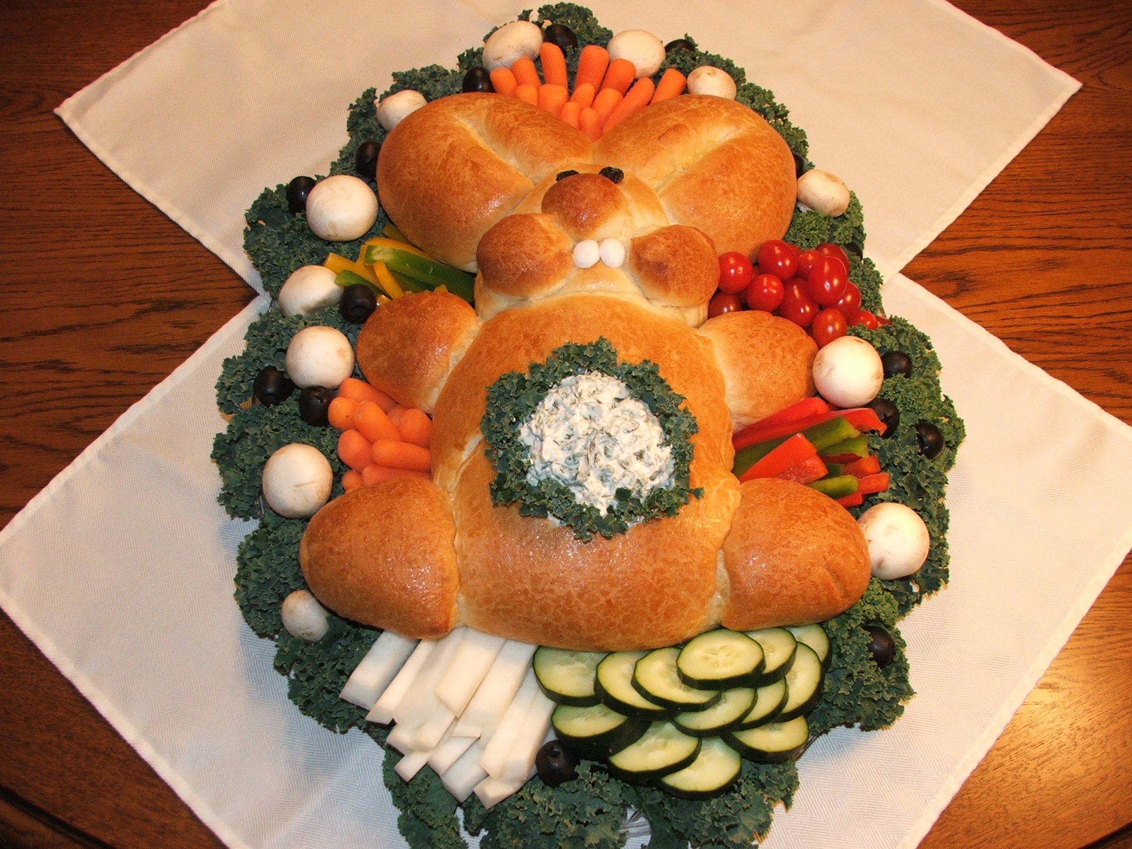2 loaves frozen bread dough, thawed (1 lb each) 2 raisins 2 sliced almonds, can sub 1 white jelly bean cut in half 1 egg, lightly beaten lettuce leaf ranch dip or spinach dip assorted fresh vegetable cracker
