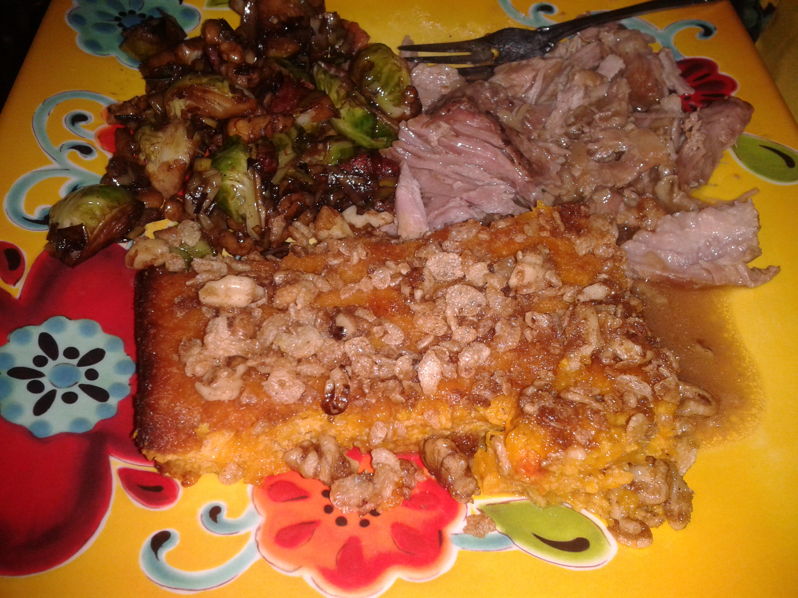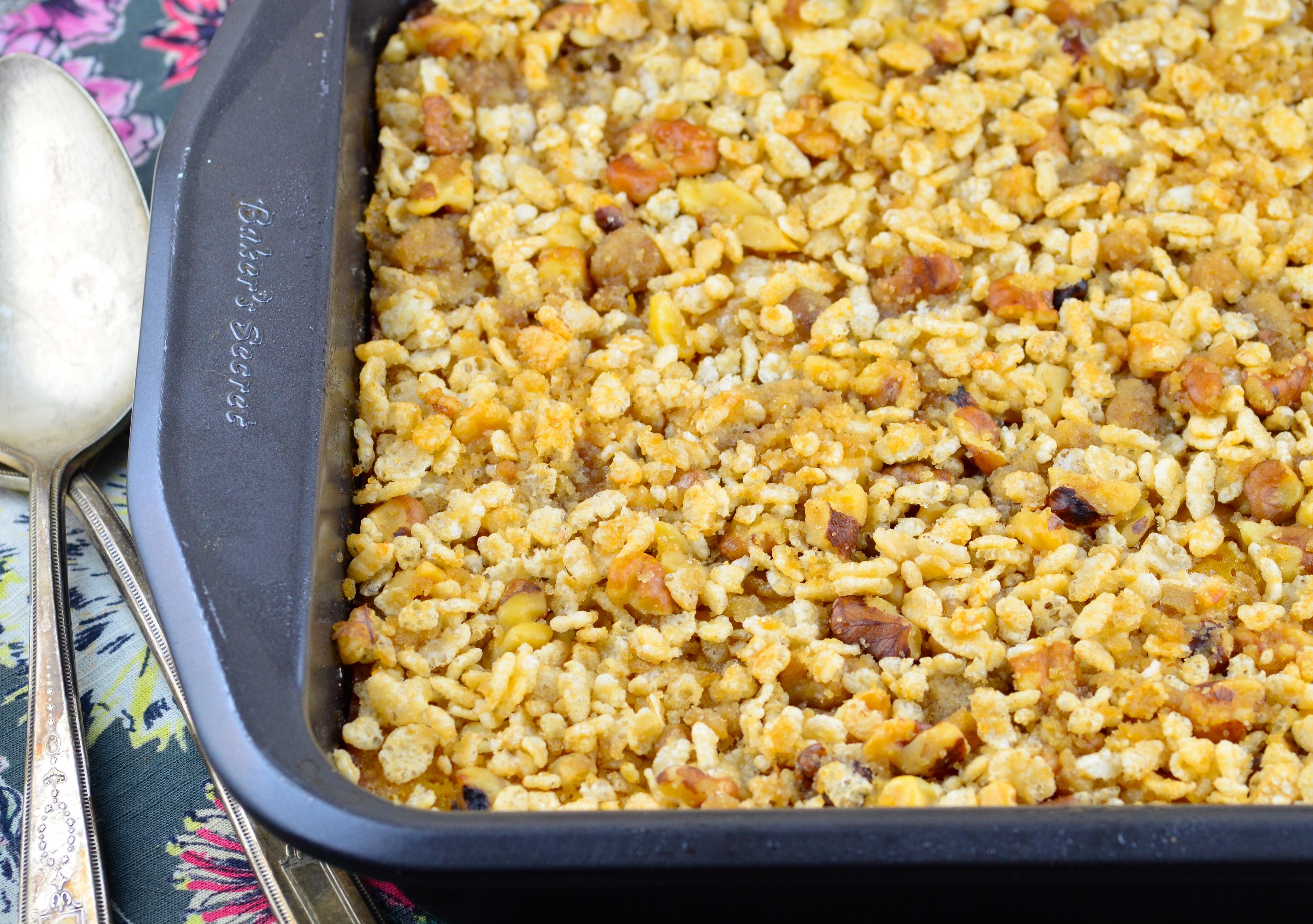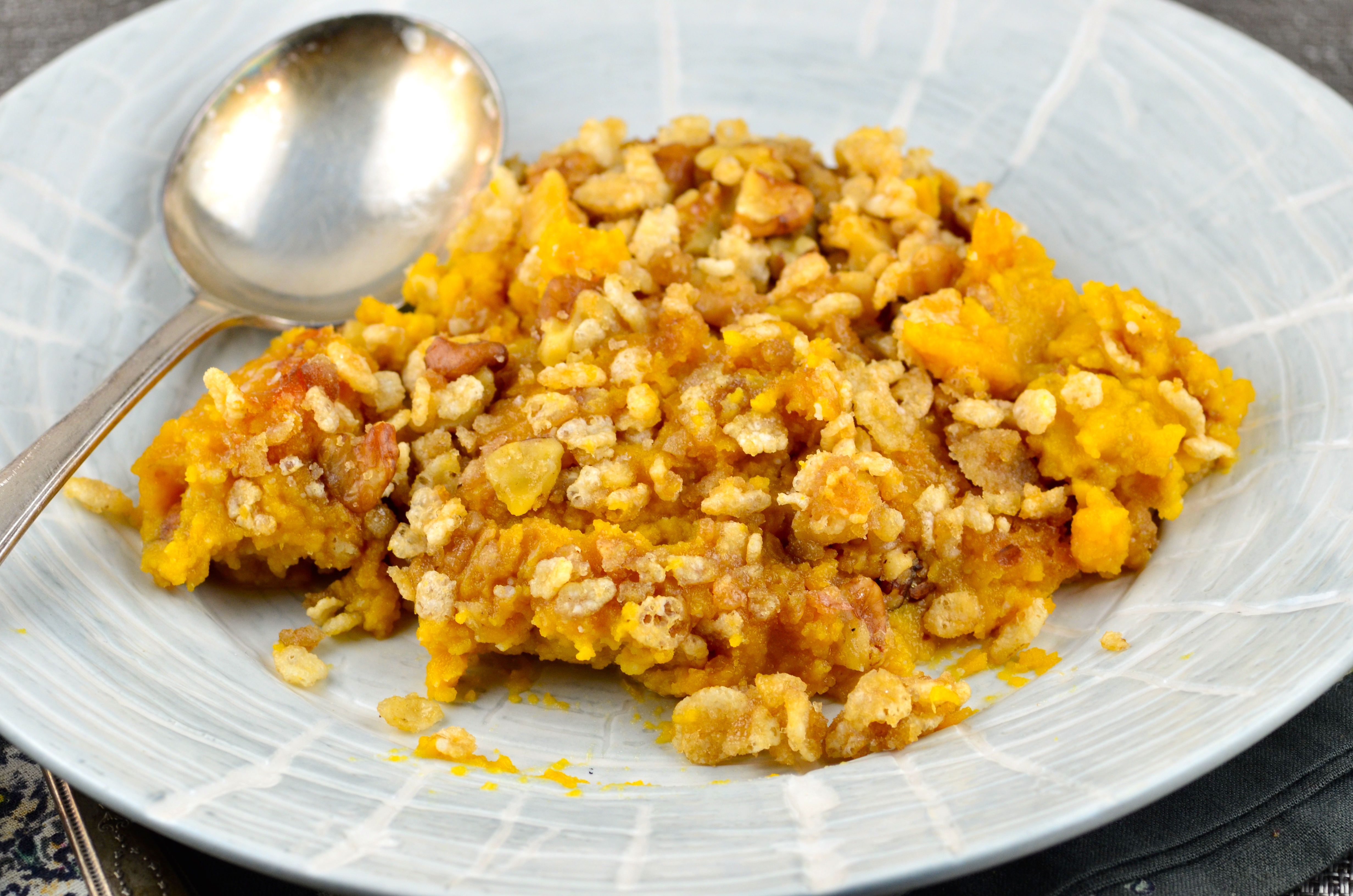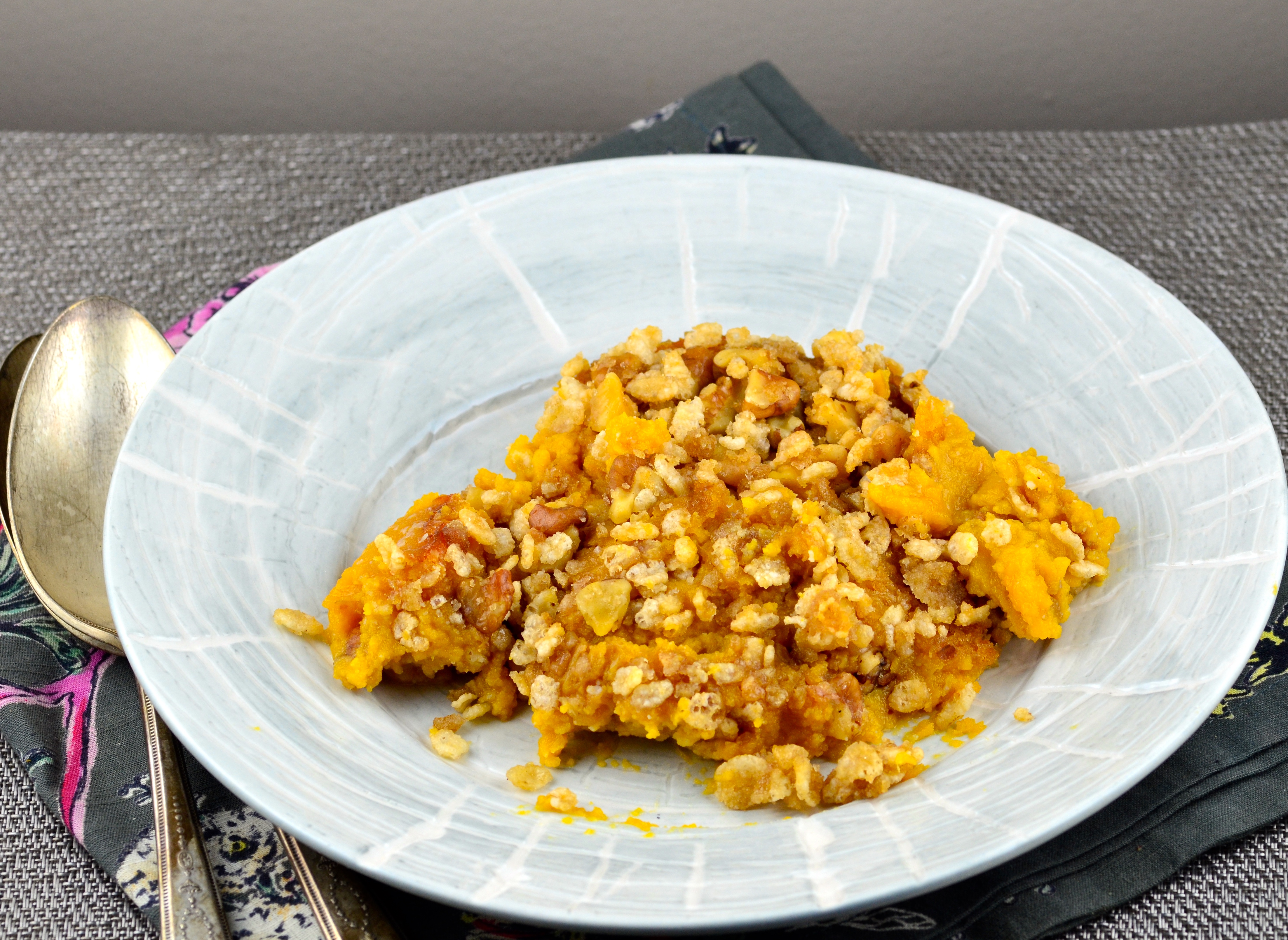 1?3 cup butter or 1/3 cup margarine, softened 3?4 cup sugar 2 eggs 1 (5 ounce) can evaporated milk 1 teaspoon vanilla extract 2 cups mashed cooked butternut squash TOPPING 1?2 cup Rice Krispies 1?4 cup chopped pecans 2 tablespoons butter or 2 tablespoons margarine, melted 1?4 cup brown sugar (optional)