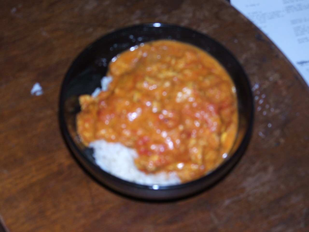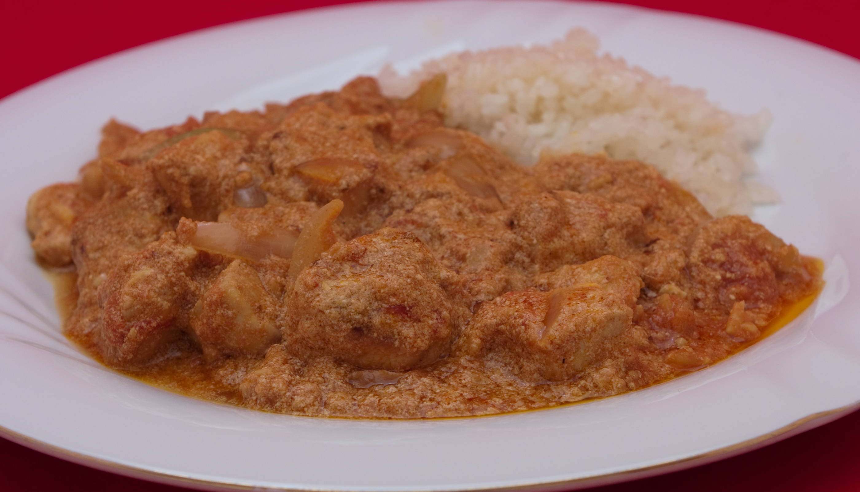 3 tablespoons butter 1 large onion, cut into thin wedges 1?4 teaspoon cinnamon 2 cloves garlic, crushed 2 teaspoons crushed fresh ginger 1?2 teaspoon turmeric 1 teaspoon ground red chili pepper 1 tablespoon coriander powder 500 g diced chicken (, breast or thigh fillet) 1?4 cup ground almonds 1 (225 g) can peeled whole tomatoes (with juice) 1 tablespoon tomato paste 1?2 cup natural yoghurt