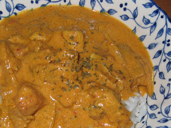 In a large pan, heat the butter until it is frothy. Add the onions and the cinnamon to the pan and fry lightly. When the onions are soft, stir in the garlic and ginger, then add the turmeric, chilli and coriander, and saute over a medium heat. Add the chicken and saute stirring constantly until the chicken meat turns white. Add the ground almonds, tomatoes and tomato paste. Mix thoroughly, cover and simmer for 20-30 minutes. Add the yoghurt and heat through gently before serving.
