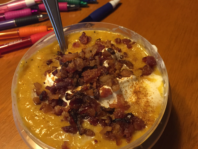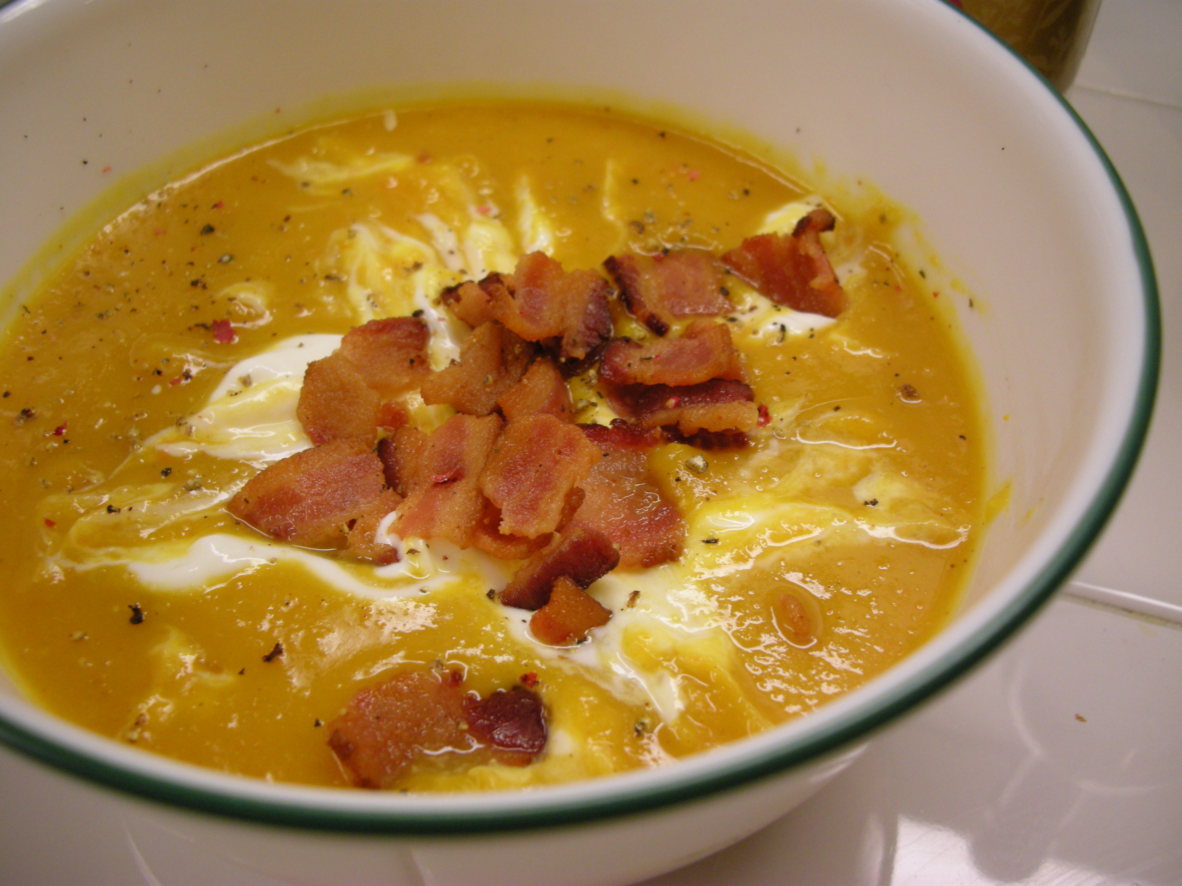 Cook bacon slices in large pot until crisp. Remove bacon and drain. Reserve 2 tbsp drippings in pan. Crumble bacon and set aside. Saute onion and carrots in bacon drippings over medium-high heat for about 5 minutes (until onion is tender). Add celery and apple to pan and saute 5 minutes. And garlic and saute 1 minute. Add squash and chicken broth. Bring to a boil, reduce heat and simmer for 20 minutes or until carrots are tender. Process mixture, in batches, in a blender or food processor until smooth. (Hot mixtures will erupt out of blender if too full- believe me I know). Return mixture to pot. Stir in lime juice and next 7 ingredients. Simmer for 7-10 minutes or until thickened. Top soup with crumbled bacon and garnish with sour cream and red pepper.