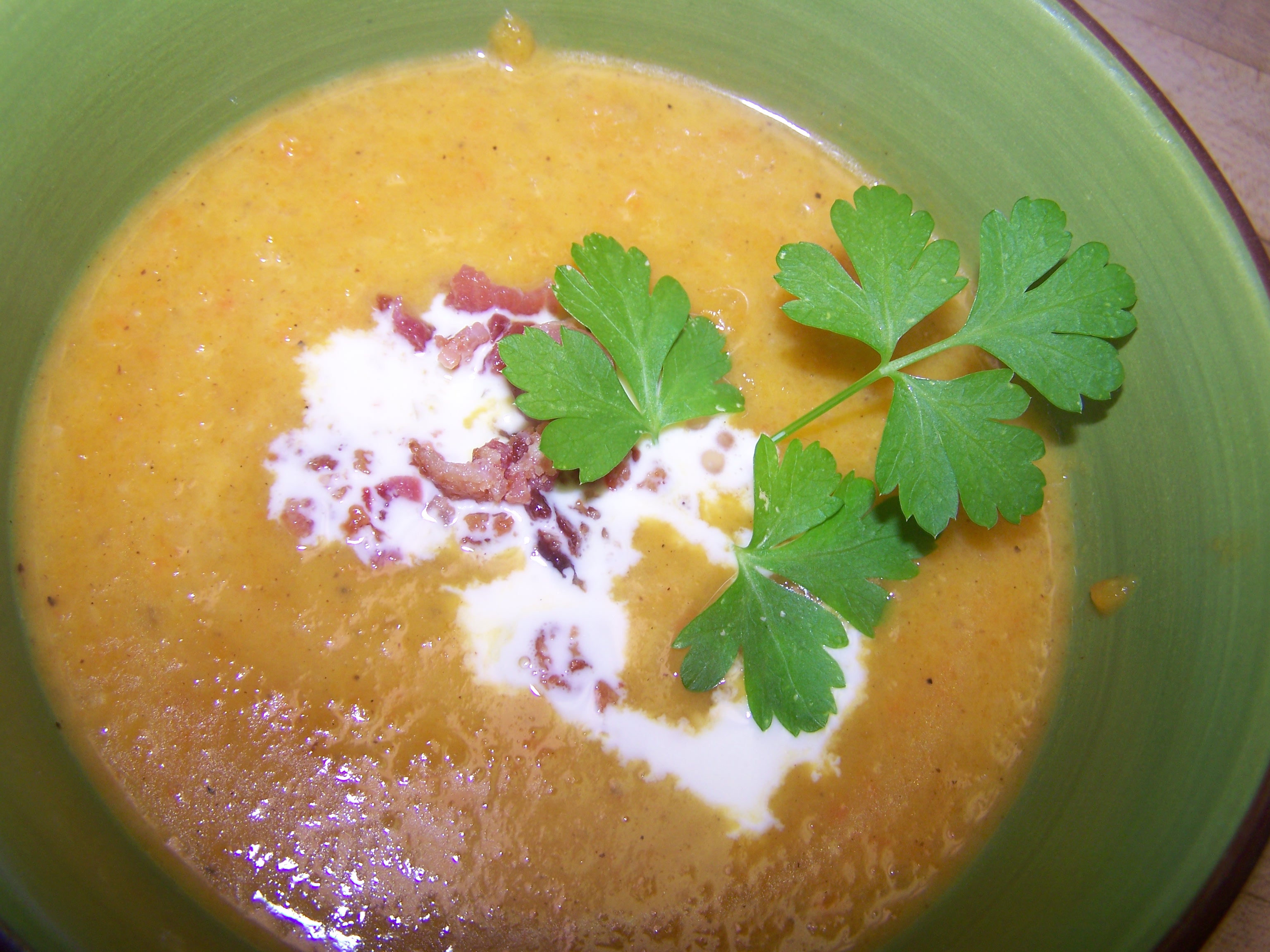 6 slices bacon 1 large onion, chopped 2 carrots, chopped 2 celery ribs, chopped 1 granny smith apple, peeled and finely chopped 2 garlic cloves, chopped 4 (12 ounce) packages frozen butternut squash, thawed or 3 lbs fresh butternut squash, peeled, seeded and chopped 1 (32 ounce) container fat-free low-sodium chicken broth 2 tablespoons fresh lime juice 1 1?2 tablespoons honey 2 teaspoons salt 1 teaspoon ground black pepper 1?8 teaspoon ground allspice 1?8 teaspoon ground nutmeg 1?8 teaspoon ground red pepper 1?4 cup whipping cream sour cream (for garnish) ground red pepper (for garnish)